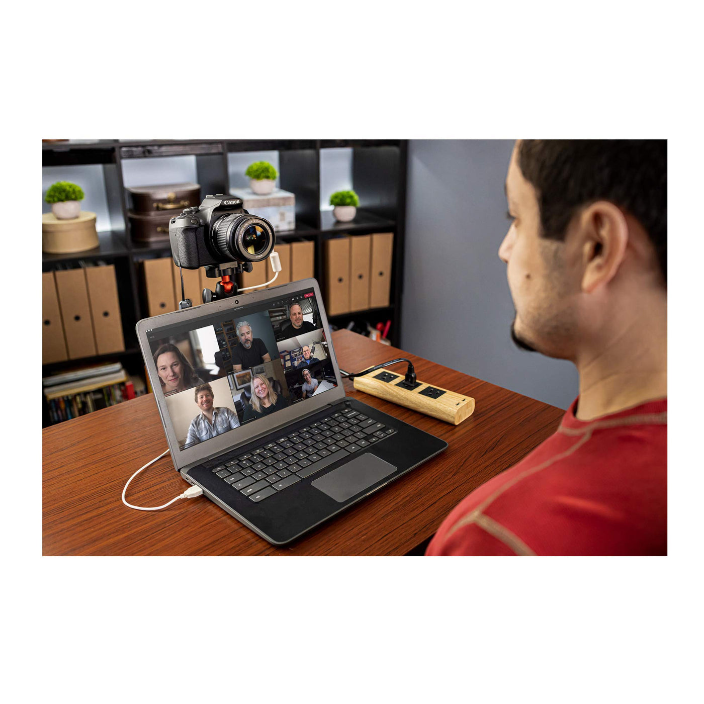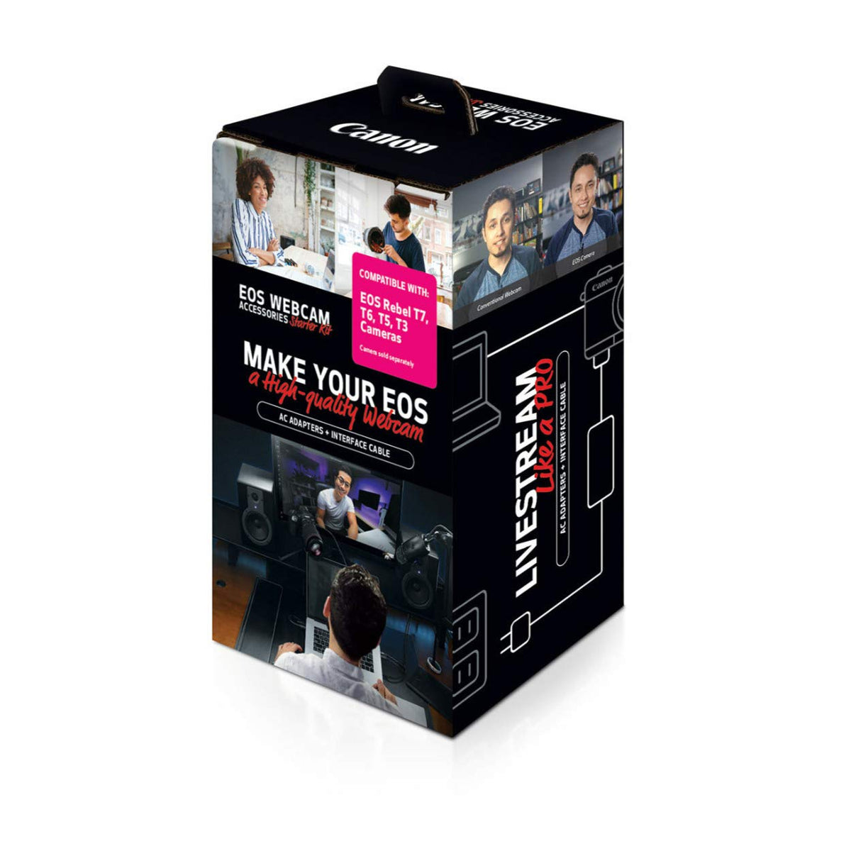 With the Canon EOS Webcam Accessories Starter Kit (For Select EOS Rebel Cameras)*, your digital camera is transformed into a high-resolution webcam for streaming, video conferencing, and content creation. Your starter kit includes a Compact Power Adapter CA-PS700, DC Coupler DR-E10, and a USB Cable IFC-400PCU. Simply download our free webcam utility software to get started. In addition, plug your Canon EOS Rebel laptop webcam into any standard AC outlet for continuous shooting using the Compact Power Adapter CA-PS700 and DC Coupler DR-E10. Plus, transfer images directly from the camera to your PC or Mac computer with the USB Cable IFC-400PCU. Create crisp, clear content from anywhere whether indoors, outdoors, in-studio, or near a tabletop. * This kit is compatible with the following EOS Rebel Cameras: EOS Rebel T7, EOS Rebel T6, EOS Rebel T5 and EOS Rebel T3. Camera and lens(es) sold separately.