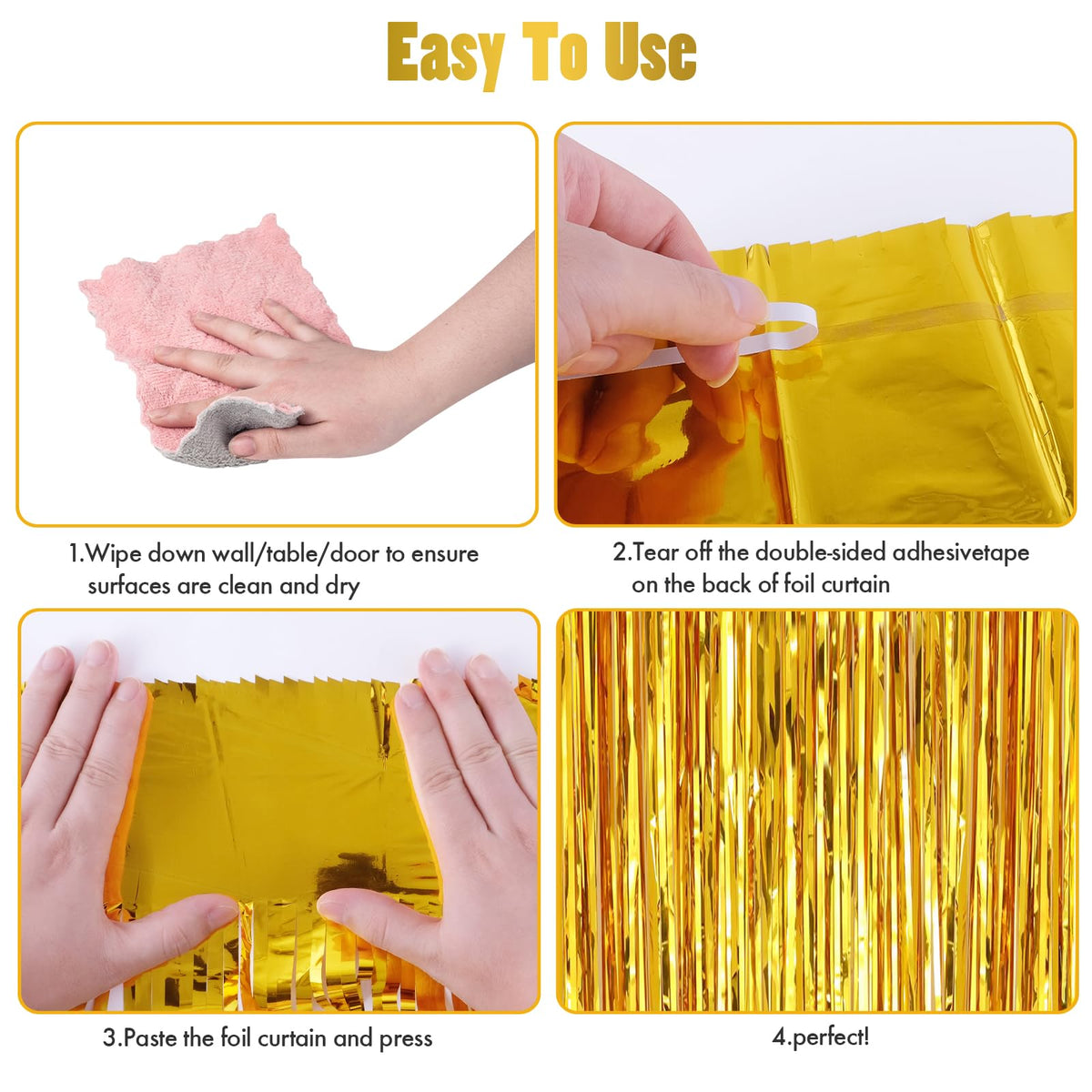 Q: How easy is it to install the foil fringe curtains?A: The installation is hassle-free; the curtains come with double-sided tape on the top. Simply peel off the plastic strip and stick them to any smooth surface like walls, windows, or doors.