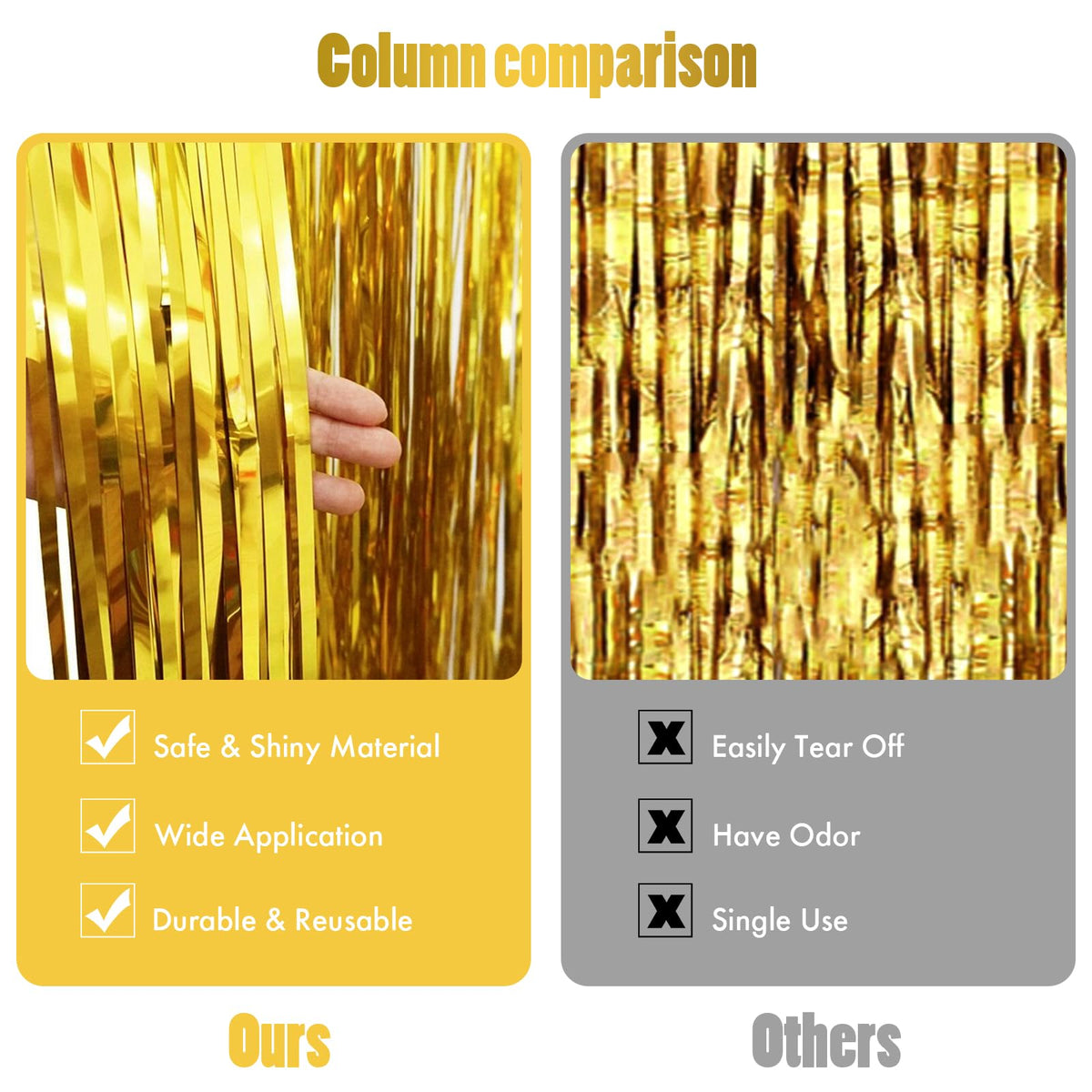Q: Are the materials used in these curtains safe for children and pets?A: Yes, the gold tinsel backdrop is made from high-quality, non-toxic, and odorless materials, ensuring safety for families with children and pets during celebrations.