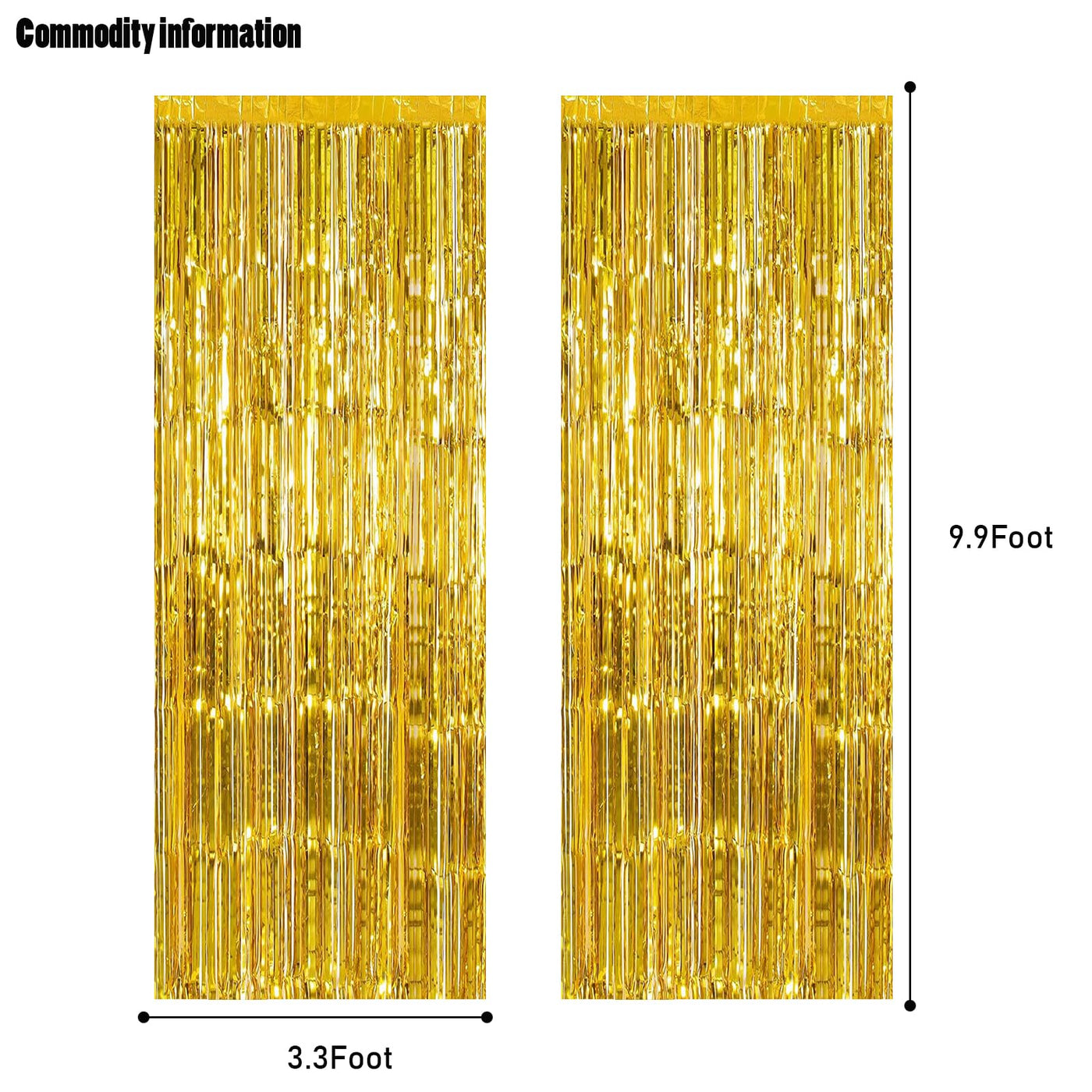 Q: What are the dimensions of the CANREVEL Gold Foil Fringe Backdrop Curtains?A: Each curtain in the CANREVEL 2 Pack measures 3.3 feet wide by 8.2 feet tall, making them suitable for hanging on doors or covering walls for a full backdrop effect.