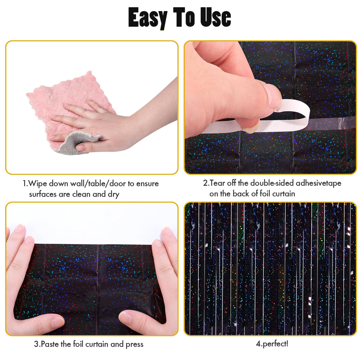 Q: How easy is it to install the foil curtain backdrop?A: Installation is hassle-free as each curtain comes with double-sided tape on the top. Simply peel off the plastic strip and stick it to any smooth surface like walls, windows, or doors.
