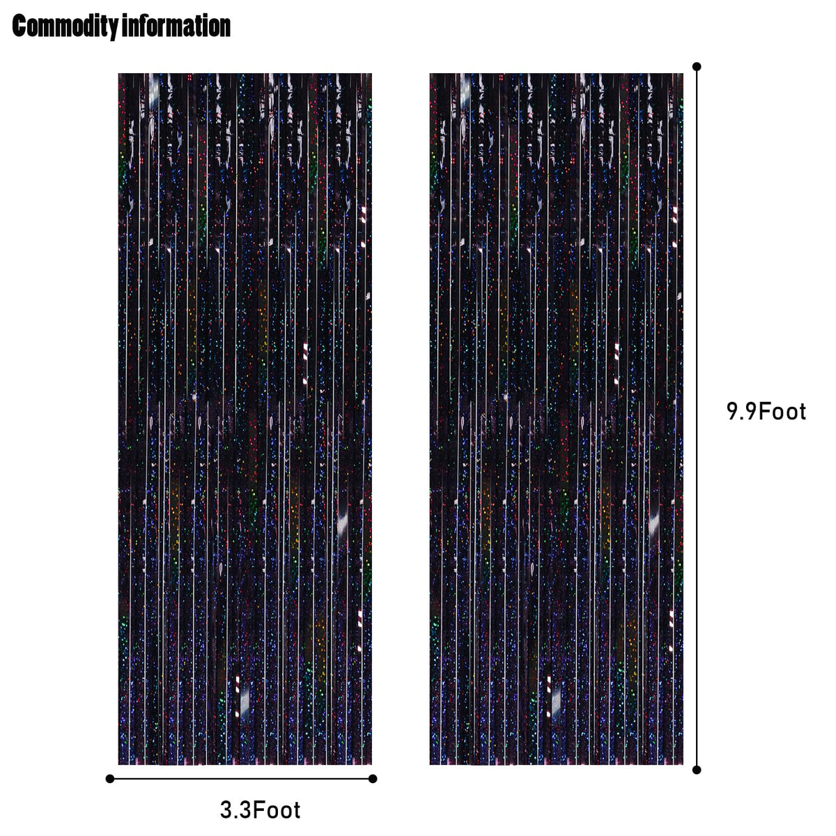 Q: What are the dimensions of the CANREVEL foil fringe curtains?A: Each of the two black foil fringe curtains measures 3.3 feet in width and 8.2 feet in height, making them suitable for hanging on doors or covering walls.