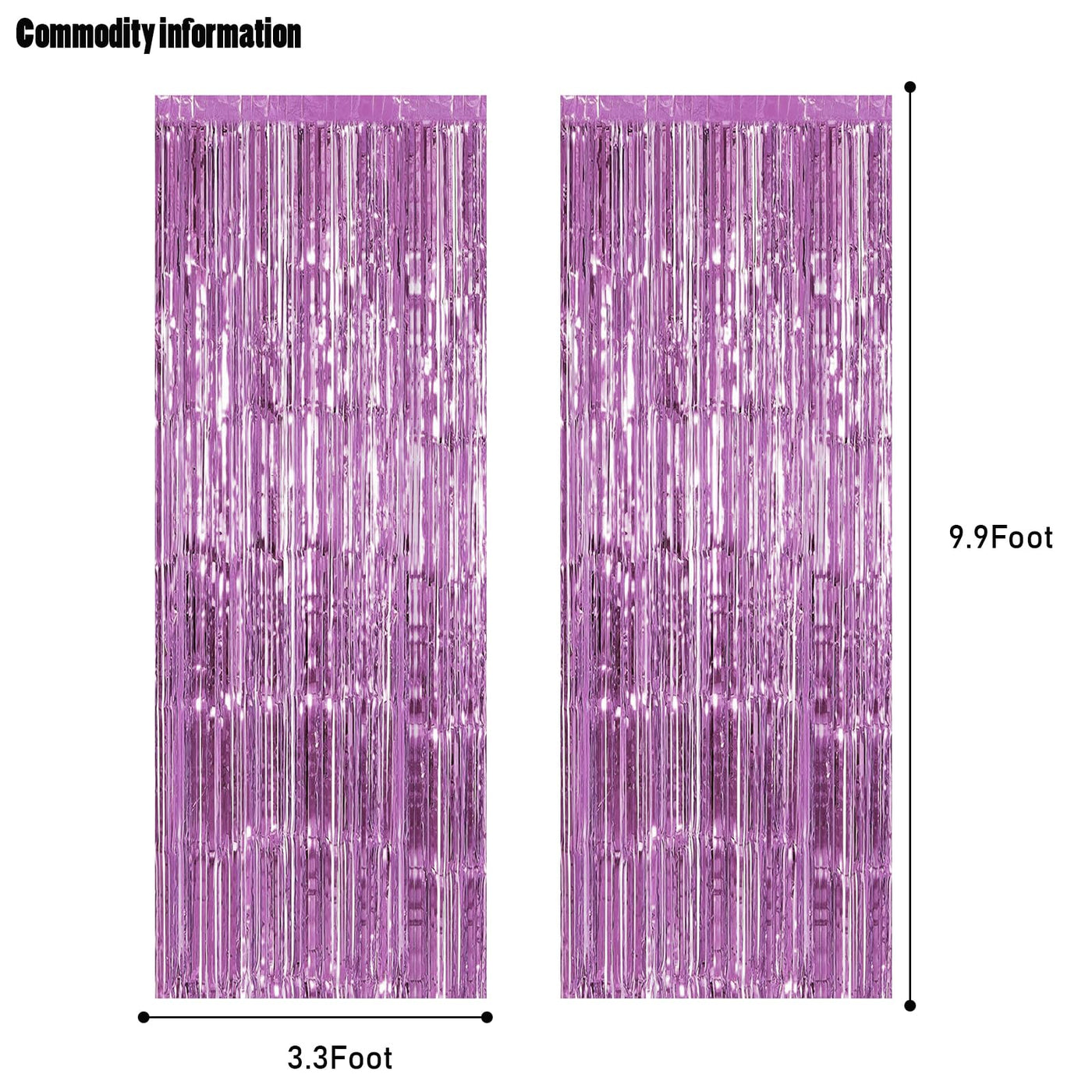 Q: What are the dimensions of the CANREVEL pink foil fringe curtains?A: Each tinsel curtain measures 3.3 feet by 8.2 feet, making them suitable for hanging on doors or fully covering walls for your party decorations.