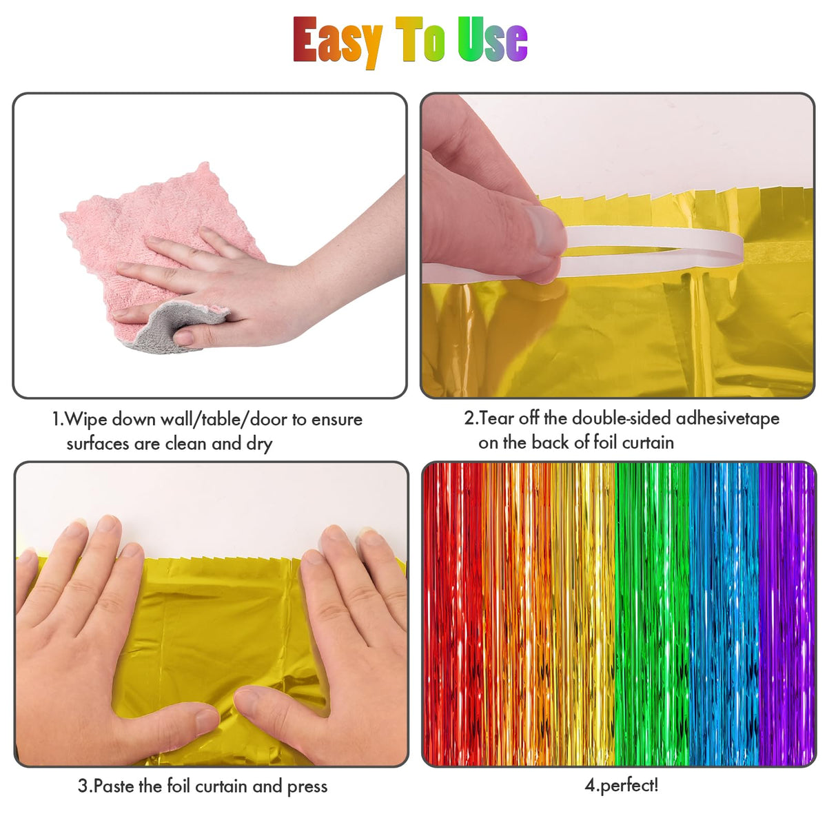Q: How do I install the foil fringe curtains?A: Installation is hassle-free as the foil curtain backdrop comes with double-sided tape on the top. Simply peel the plastic strip off and stick it to any smooth surface like walls, windows, or doors.