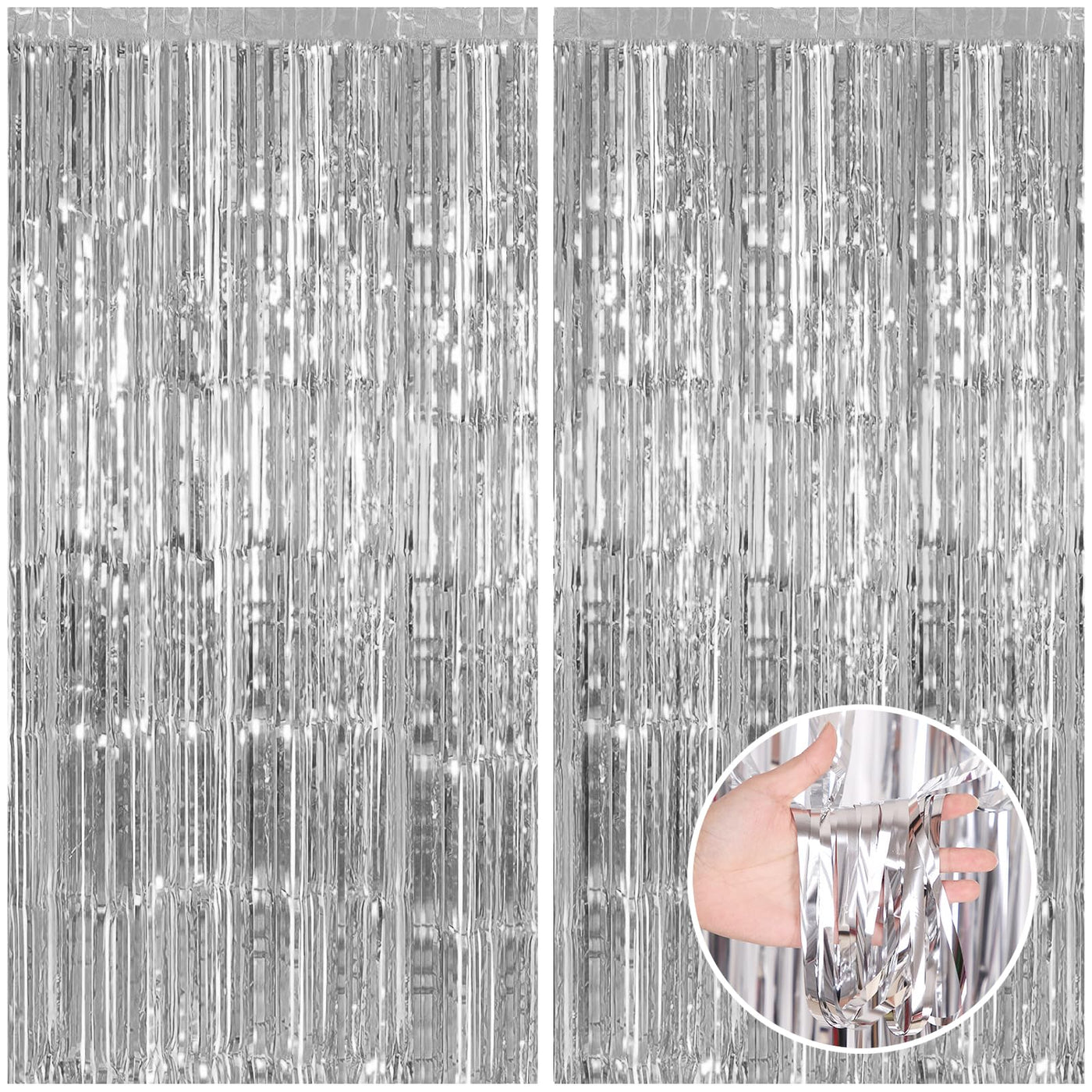 Q: What is the size of each fringe curtain, and how many come in a pack?A: Each pack includes two silver foil fringe curtains, with each curtain measuring 3.3 feet by 8.2 feet. This size is ideal for hanging on doors or covering walls, providing ample coverage for your party decorations.