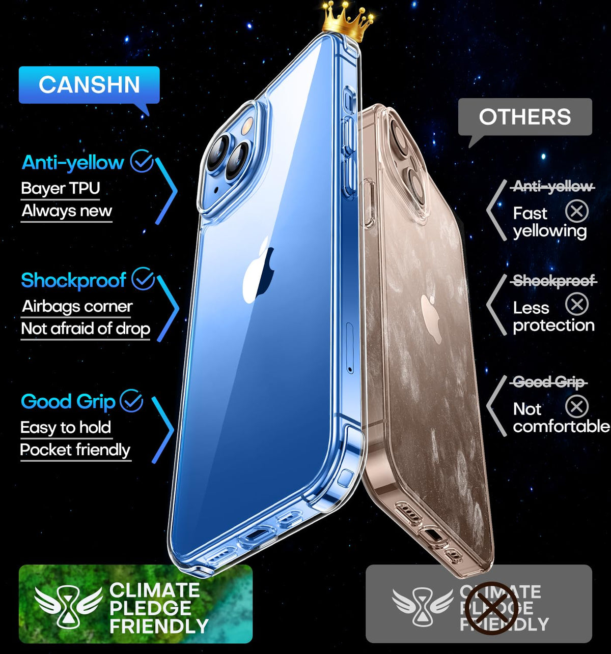 Q: What materials are used in the construction of the case?A: The CANSHN Clear Case is crafted from durable TPU and PC materials, providing both flexibility and sturdiness while showcasing your iPhone's original beauty.
