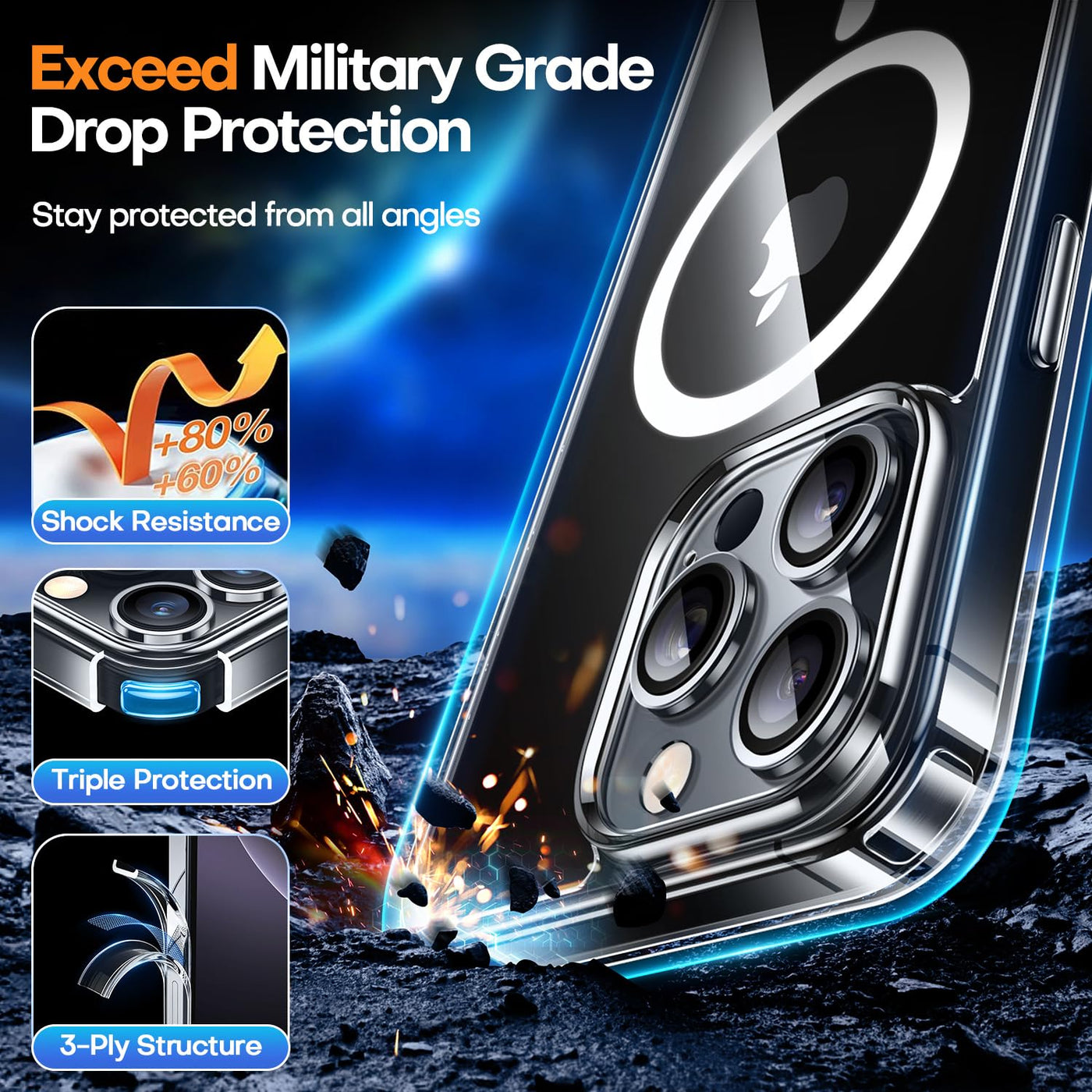 Q: What type of protection does this case provide for my iPhone 16 Pro Max?A: This case features 10FT military-grade drop protection, thanks to its shockproof TPU bumper and tough polycarbonate materials, ensuring your phone is safeguarded against accidental drops and bumps.