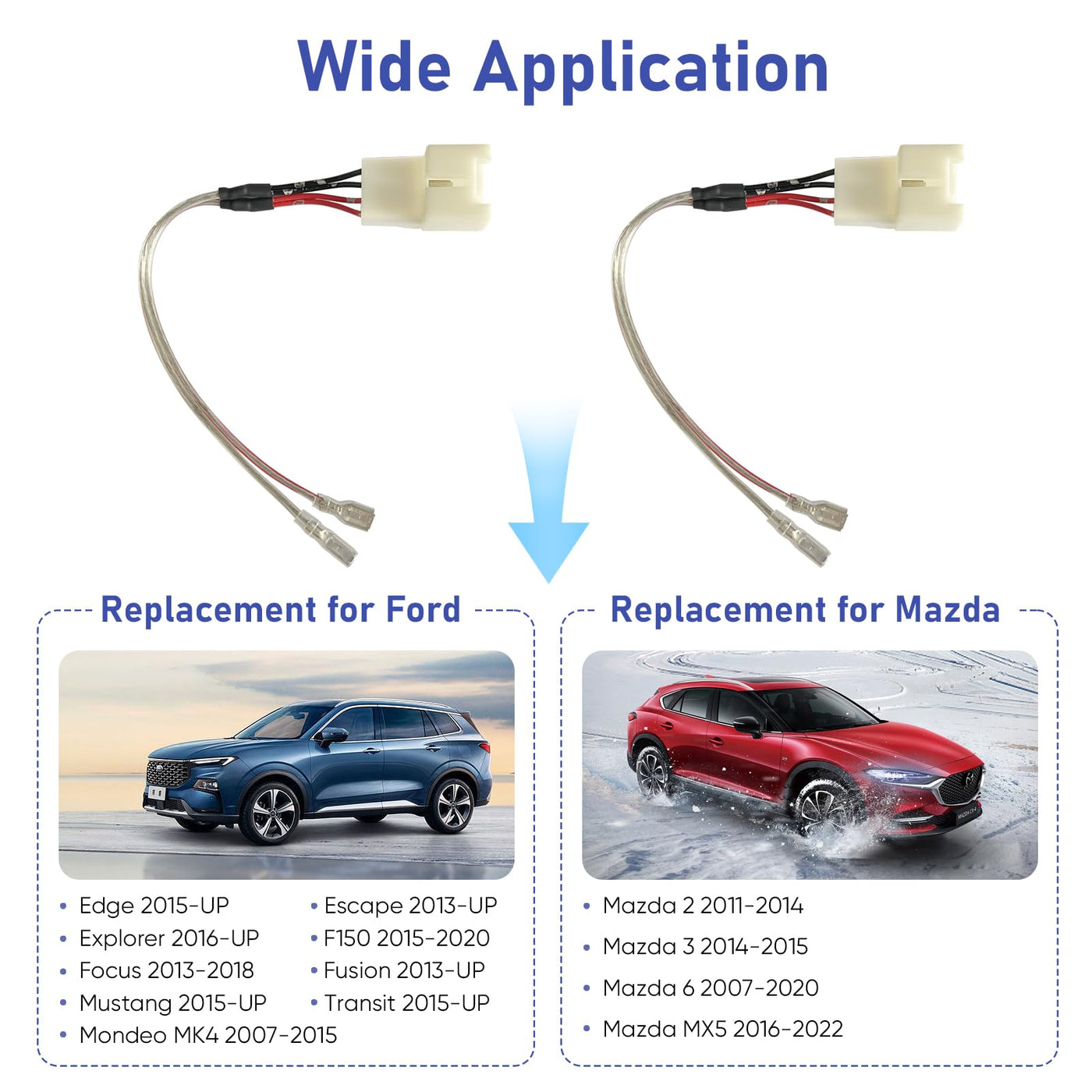 Q: What vehicles are compatible with the Car Door Speaker Wiring Harness?A: This Car Door Speaker Wiring Harness is compatible with various Ford models including the F150 (2015-2020), Escape (2013-UP), Focus (2013-2018), and Mustang (2015-UP), as well as Mazda models such as the Mazda 2 (2011-2014), Mazda 3 (2014-2015), and Mazda 6 (2007-2020). It also fits Lincoln MKX (2016-2019) and other specified models.
