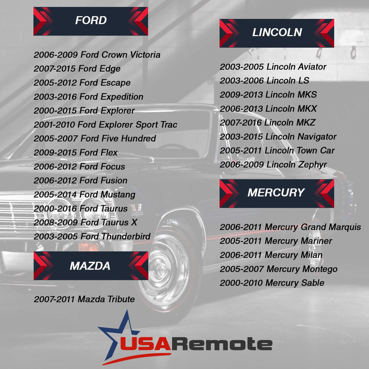 Q: What vehicles are compatible with the Car Key Fob Keyless Entry Remote?A: This key fob is compatible with various Ford, Lincoln, Mercury, and Mazda models, including Ford Crown Victoria (2006-2009), Edge (2007-2015), Escape (2005-2012), Expedition (2003-2016), Explorer (2000-2015), and others. For Lincoln, it fits models like Aviator (2003-2005) and MKX (2006-2013). It also works with Mazda Tribute (2007-2011) and Mercury vehicles such as Grand Marquis (2006-2011).