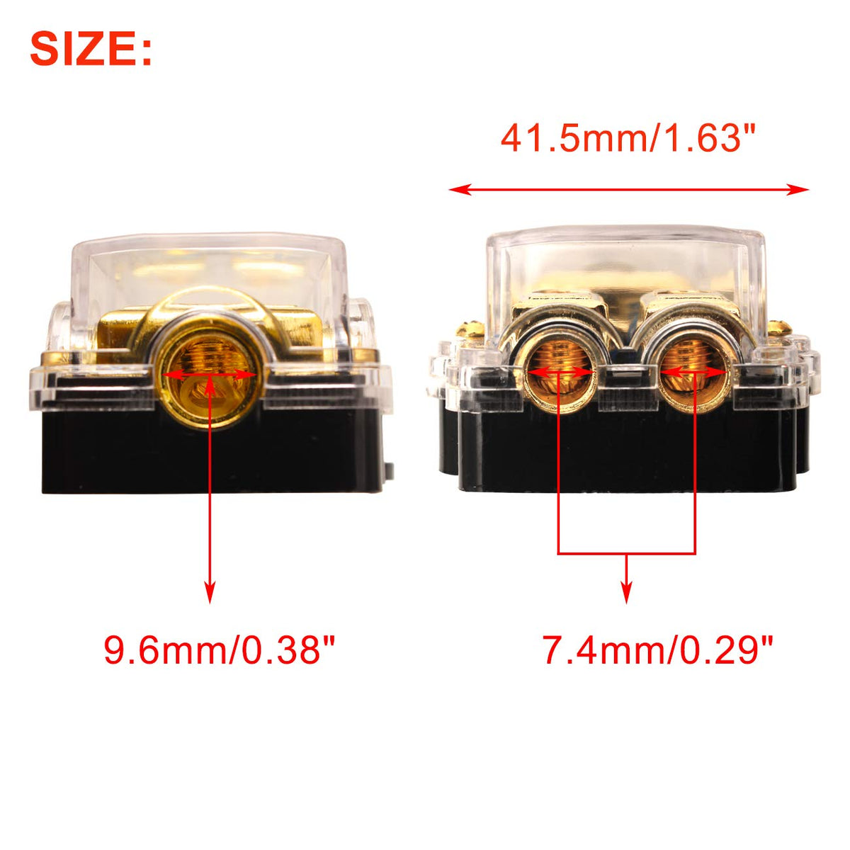 Q: What materials are used in the construction of this fuse holder?A: The fuse holder features a zinc alloy plated with 24K gold for durability, along with a polycarbon plastic shell that provides strong protection and high safety performance.