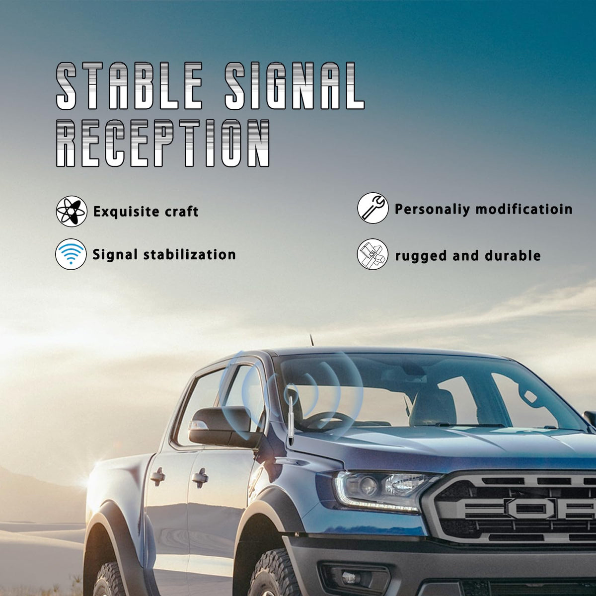 ?Trendy Appearance?Chromium Plating Process, Fashion Shaped Antenna With Smooth Curve And Smooth Appearance, In Addition, It Is Also Suitable For Pickup Trucks, Off-Road Vehicles And Other Atmospheric Vehicles, And Is Suitable For Any Weather. It Is Short And Sturdy, Can Withstand Car Washing, And Will Not Be Easily Bent Or Damaged.