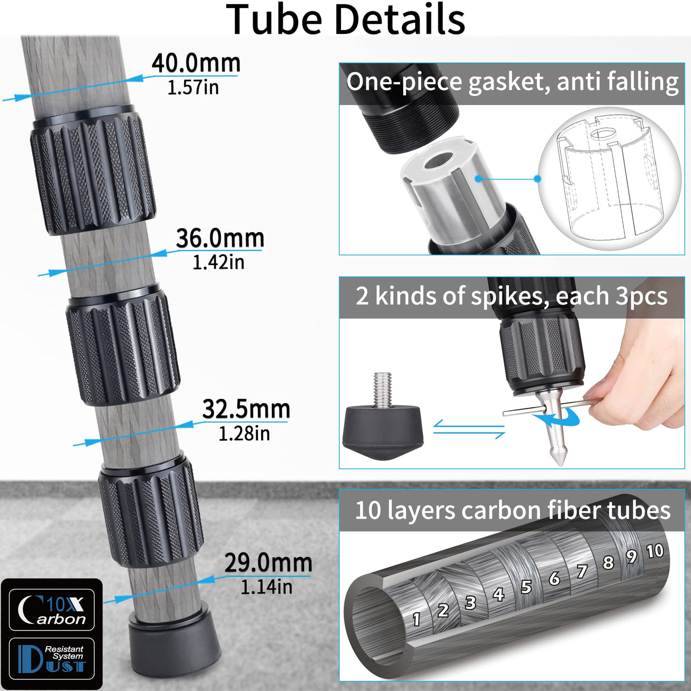 1. Material - The Camera Tripod Is Made Of Carbon Fiber For Highter Strength And Longer Service Life. 2. Workmanship - The Carbon Fiber Tripod Is Built By Top Engineers To Ensure Quality. 3. Load-Bearing - Unparalleled Overweight, Maximum Load Capacity 88Lb/40Kg.