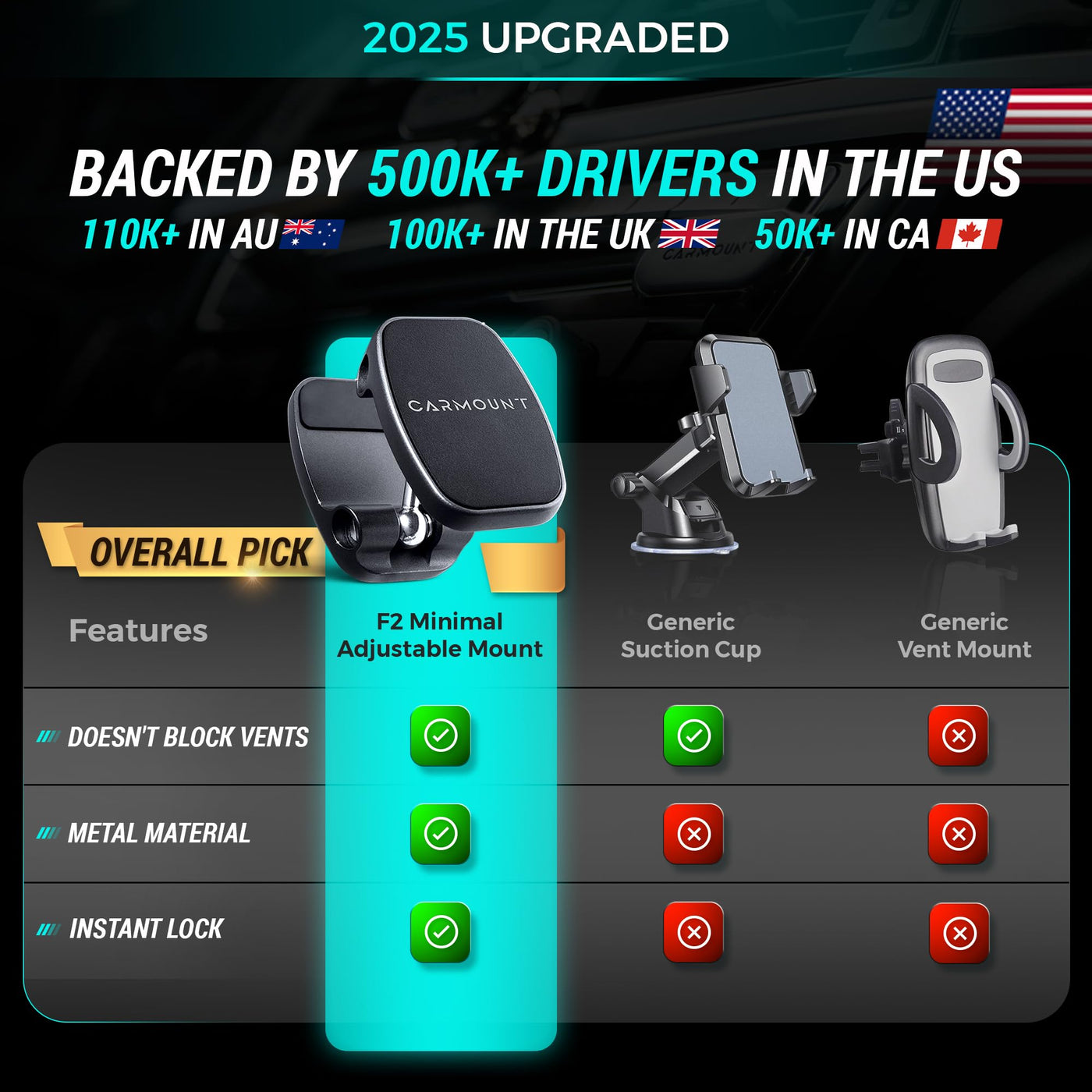 Carmount F2 Adjustable Car Mount | Magnetic Dashboard Phone Holder For Car, 6X N52 Magnets, 360 Rotation & Tilt, Universal Dash