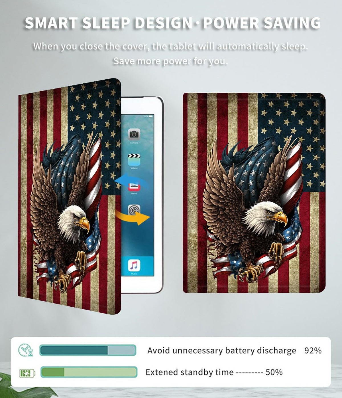 Q: What is the design of the case like, and is it portable?A: The case features a slim, lightweight design that maintains an elegant look while minimizing bulk. The colorful Eagle on American Flag design makes it stylish and perfect for on-the-go use.