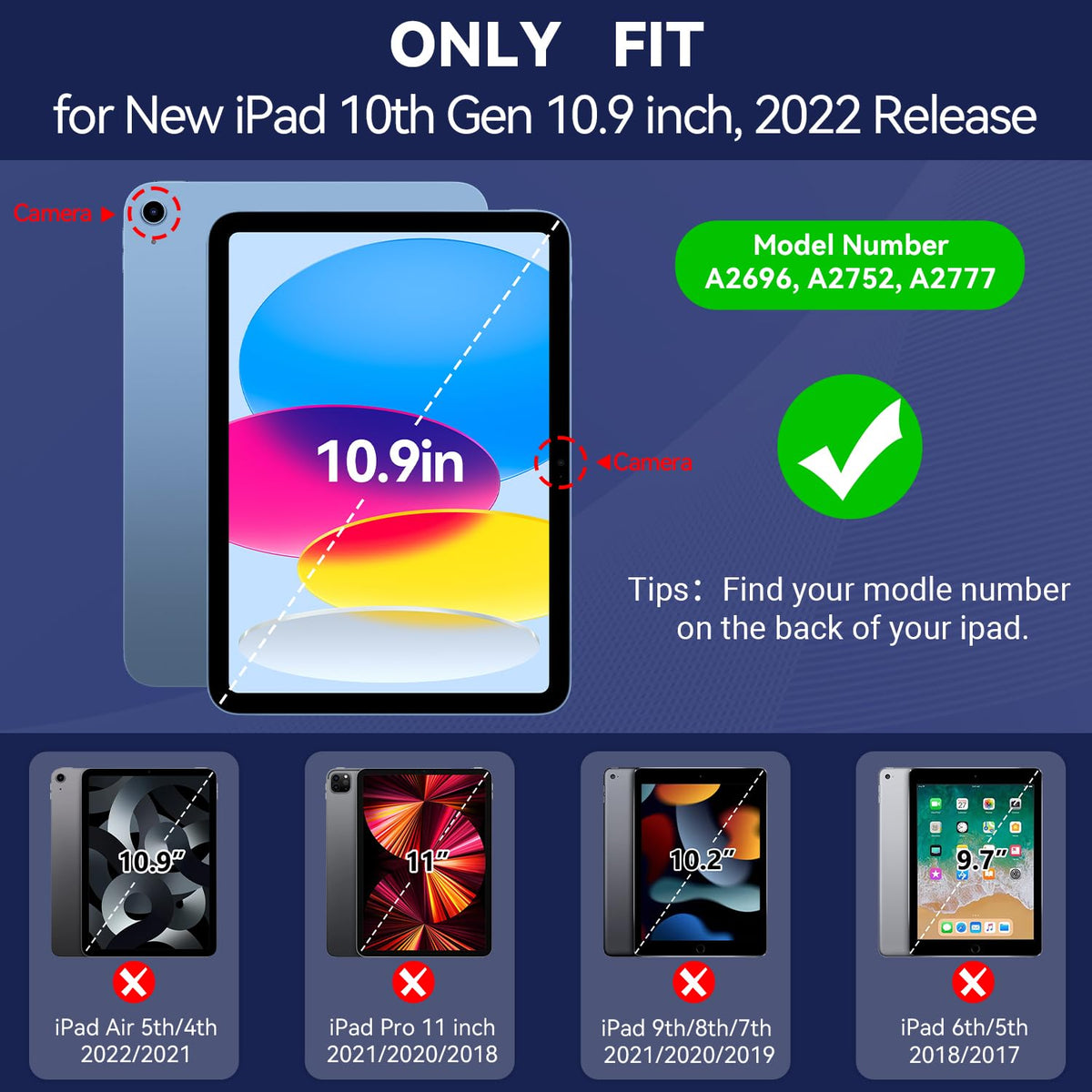 Q: Is this case compatible with all iPad models?A: No, this case is specifically designed for the iPad 10th Generation 10.9 inch (2022 Release) models A2696, A2757, and A2777. Please check your iPad's model number before purchasing.