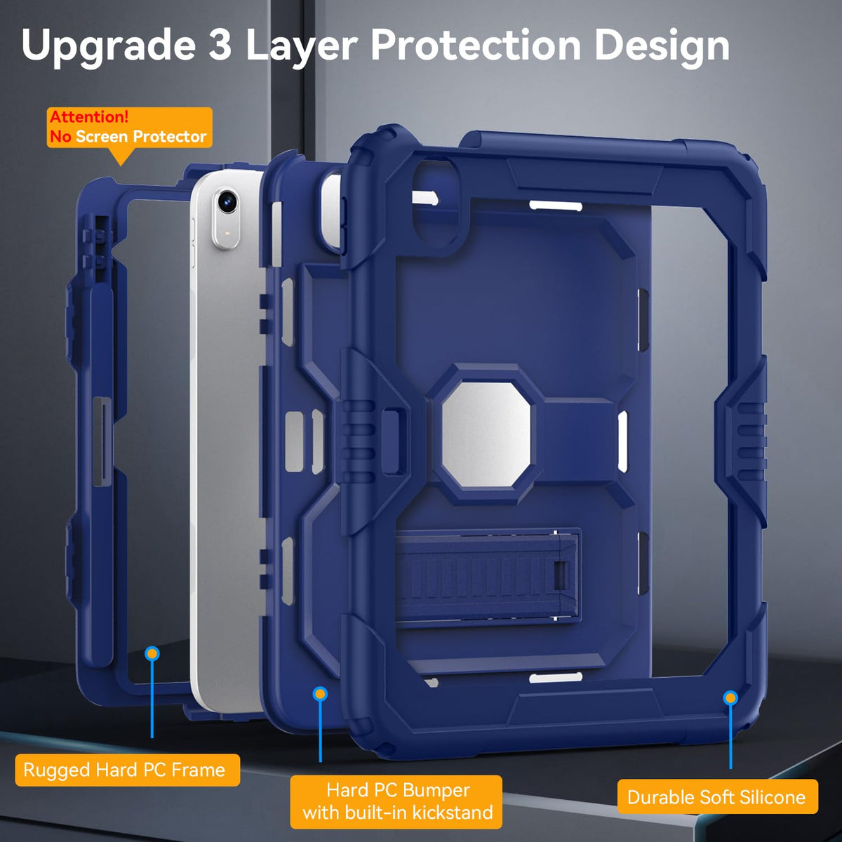 Q: What type of protection does this iPad case offer?A: The case features a 3-IN-1 shock-absorbing structure with a rugged hard PC and durable silicone outer layer, providing excellent drop protection against accidental falls, bumps, and scratches.