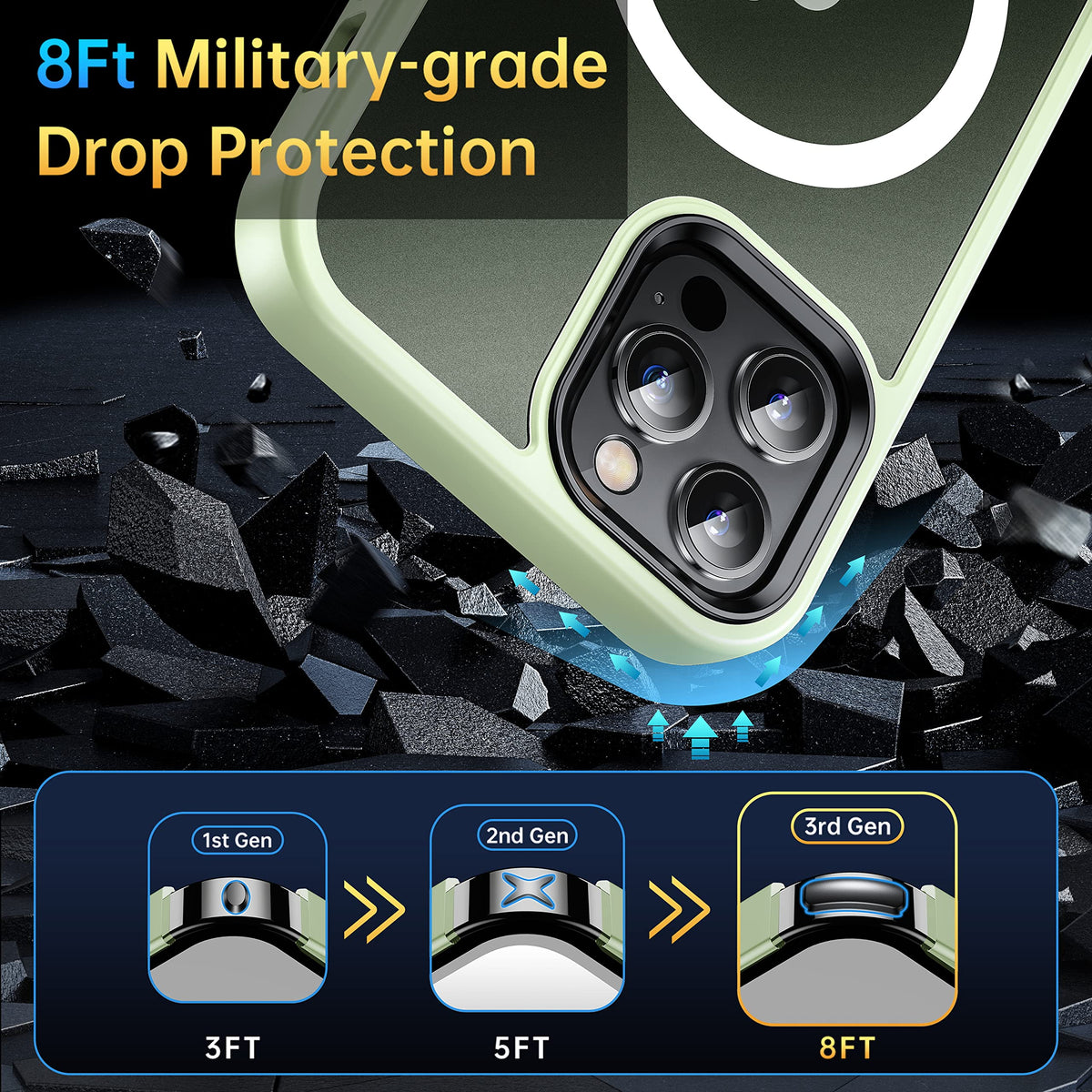 Q: What type of protection does this case offer?A: The CASEQUUE Magnetic Case provides 8ft military-grade drop protection, featuring built-in airbags in all four corners to absorb impact, ensuring your phone remains intact even after multiple drops.