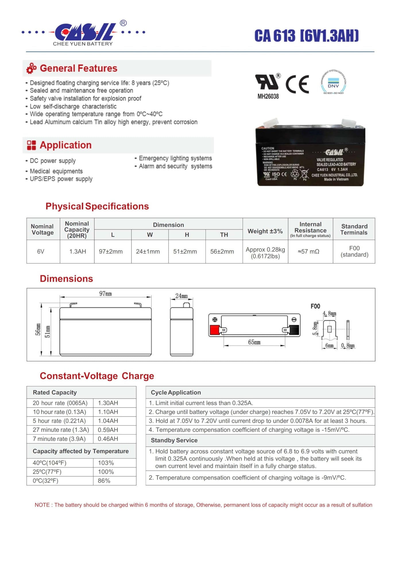6V 1.3Ah Ge 600-1054-95R Simon Xt Rechargeable Agm Sealed Lead Acid Battery By Casil Ca613: Replaces- -Weize Fp613 6V 1.3Ah -Universal Power Group Ub613 6V 1.3Ah -Powersonic Ps-613 6V 1.3Ah - Exp613 6V 1.3Ah -Neptune Nt613 6V 1.3Ah -Mighty May Ml1.3-6 6V 1.3Ah Our Casil Maintenance-Free Lead-Acid Batteries Are Maintenance Free, Eco-Friendly And Have Low Internal Resistance. The Batteries Are Widely Applied To Emergency Lamps, Portable Lamps, Electric Scooters, Electronic Instruments, Ups Systems, Gps Systems, Etc. Scope Of Application: ? Float Charging ? Burglar / Fire Alarms ? Solar Power Equipment ? Emergency Lights ? Office Equipment ? Telecommunications Systems ? Computer ? Currency Detectors ? Uninterruptible Power Supply Specifications : Voltage: 6 Volt Amperage: 1.3 Ah Chemistry: Sla, Agm Terminal: F1 Battery Dimensions: 3.82 Inches X 0.96 Inches X 2.22 Inches Package Weight: 15 Oz Package Included: 1 X Battery (Screws Included, But Not Included Wire Harness Or Mounting )