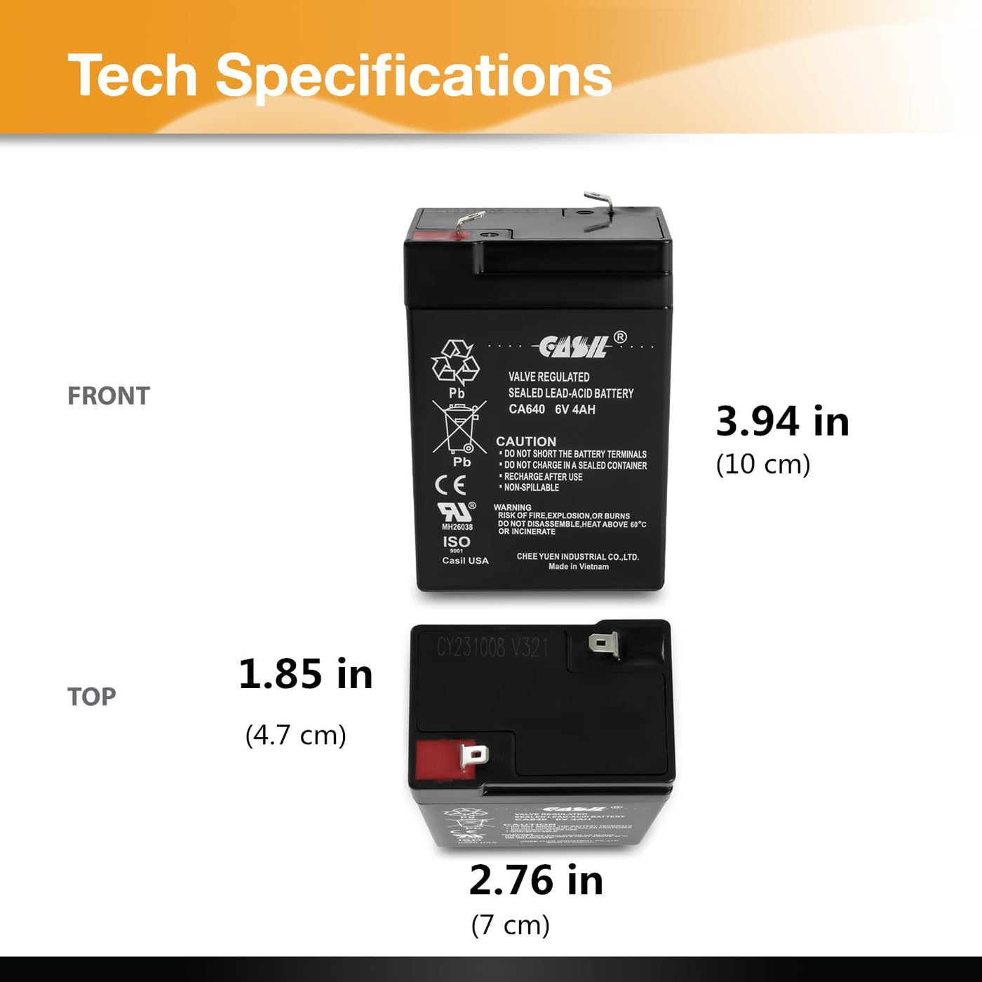 Q: What are the dimensions of the Casil CA640 6V 4Ah UPS Battery?A: The dimensions of the Casil CA640 6V 4Ah UPS Battery are 2.76 inches in length, 1.85 inches in width, and 3.94 inches in height.
