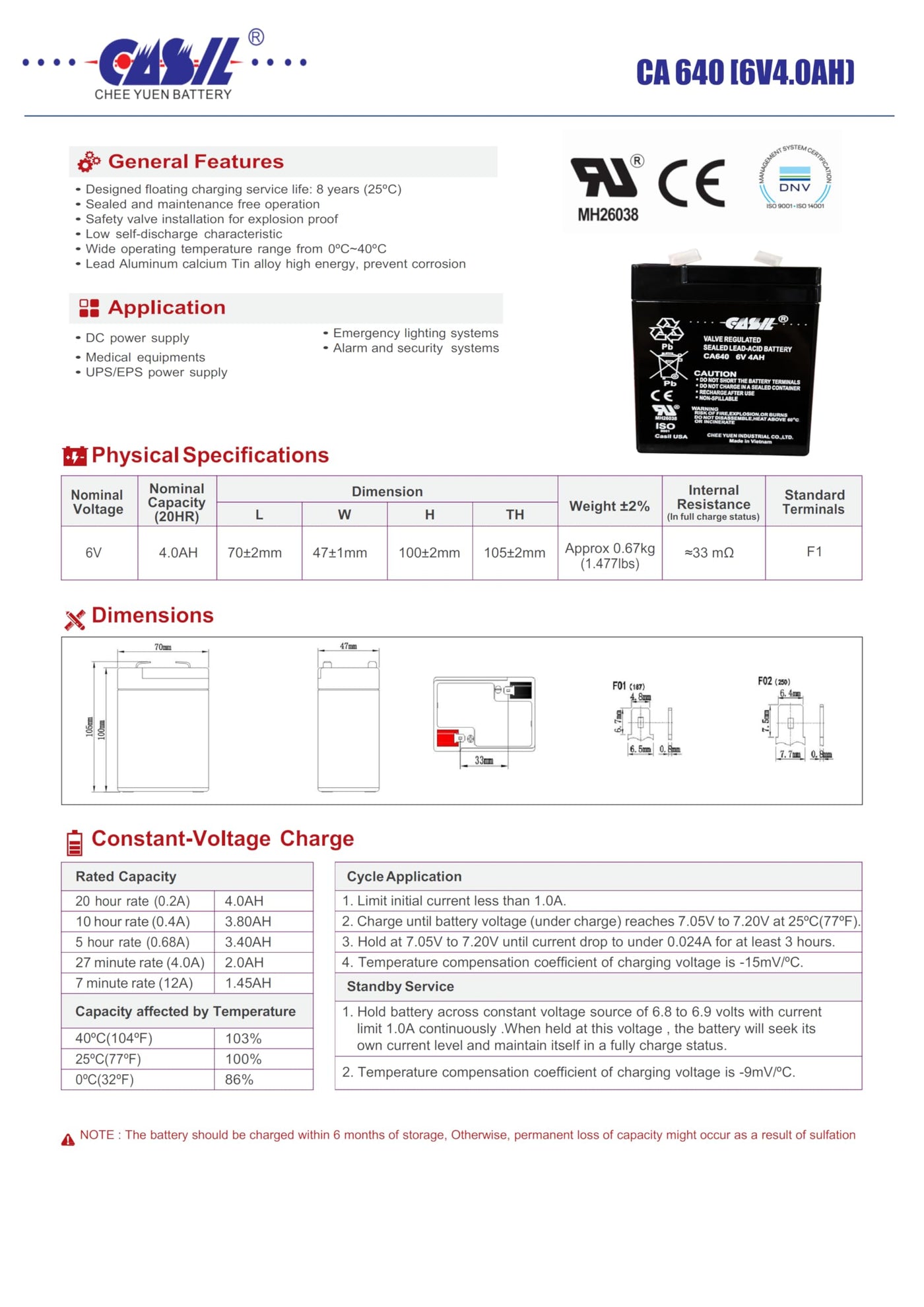 Q: What is the battery's maintenance requirement?A: The Casil CA640 6V 4Ah Battery is a maintenance-free Sealed Lead Acid (SLA) battery, which means it does not require regular maintenance to ensure optimal performance.