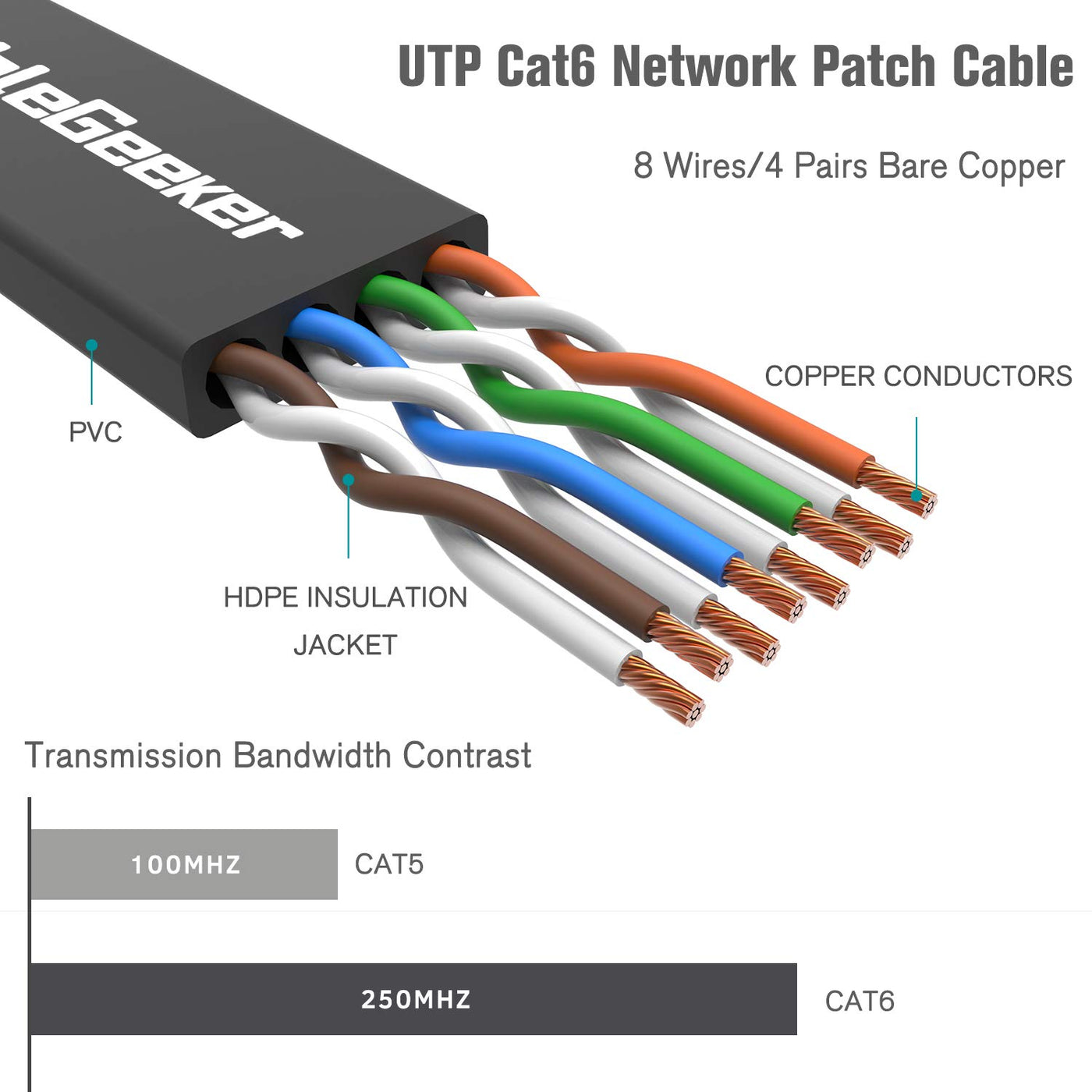 Search No More .You Finally Found The Cable Highly Met To Your Demand Features: Category 6 (Class E) Cable Cable Type: Cat6 4-Pair Utp 100% Bare Copper Outside Diameter: 5.8 0.3 Mm (0.23 0.01 Inch) Connector Type: Rj45 Contact Plating: 50 Micron Gold Plated Conductor Gauge: 31 Awg Cable Performance: Up To 250 Mhz Cable Structure: Stranded Ul Listed, Tia/Eia 568-C.2 Verified, Rohs Compliant Ultra Slim And Flat To Improving The Look Of Your Home Or Office. With Just 0.05 Inch Thin, The Flat Cable Makes It Easy To Fit Between Spaces, Which Are Perfect Camouflage Underneath Carpets, Walls, Or Even Behind Furniture. High Speed And Reliable Connectivity Cat6 Flat Ethernet Cable Is Capable Of Transmitting Data At Speeds Of Up To 1.0Gbps Over 100M Run Of Cable. Compared To Cat5E Cable, The Improved Quality In Twisting Of The Wires Provides Better Immunity From Crosstalk, Noise, And Interference That Can Degrade The Signal Quality. Special For Home And Office Network It Is Made Out Of 4 Unshielded Twisted Pair (Utp) Of Copper Wires With Two Rj45 Connectors On Each End. Rj45 Connectors Offer Universal Connectivity To Computers And Network Components, Such As Routers, Switch Boxes And Network Attached Storage Devices. Also For Ps4,Ps3,Xbox Gaming And Other Game. Surfing The Net, Stream Video, Music, And Other Data At Greater Speed Without Worrying About Cable Mess Note: Your Network Speed Is Determined By Many Factors ,Which Include The Cable, Your Router, Switch Boxes, Other Network Components, And Also Service Provider.
