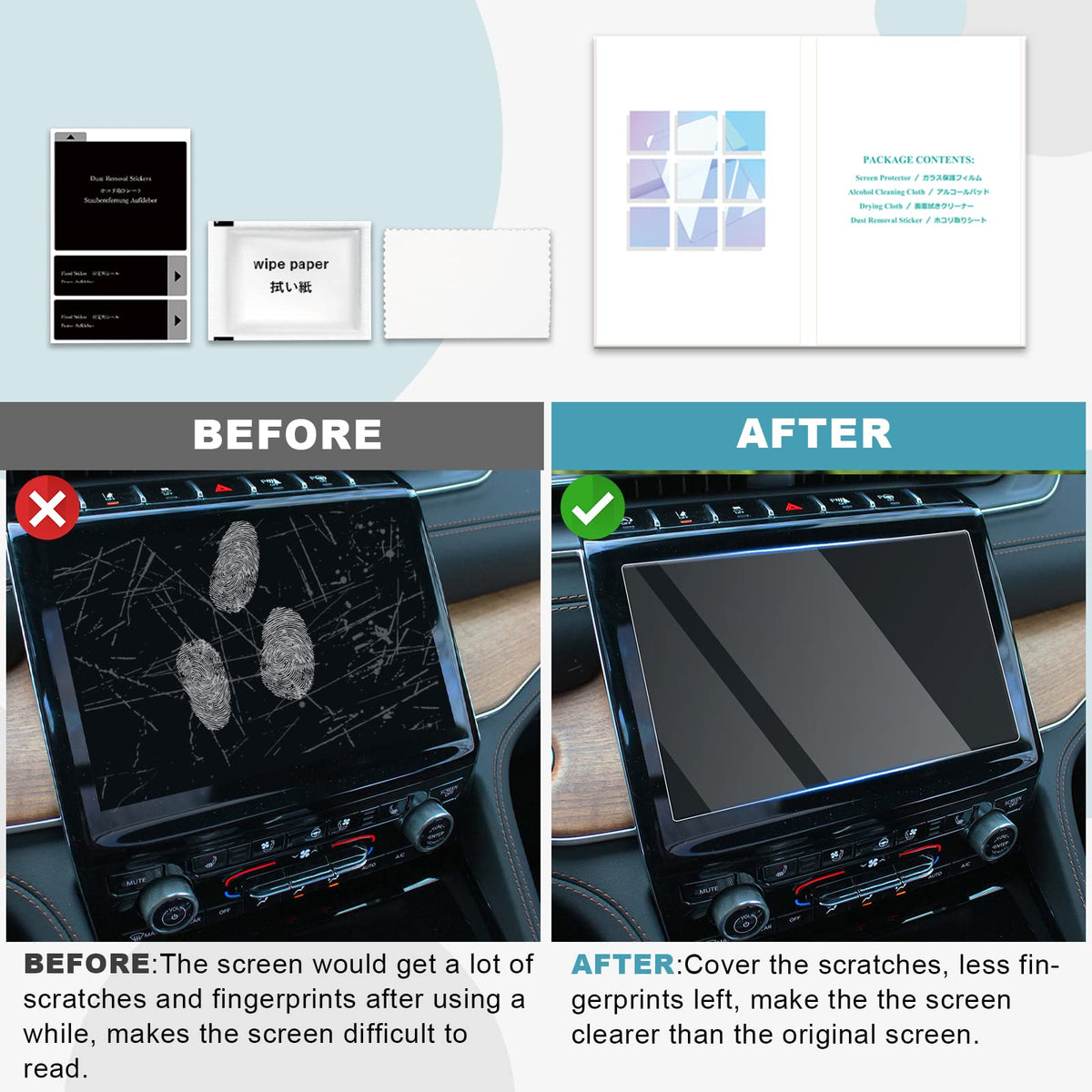 Package Contents: 1 X 2022-2024 Grand Cherokee Screen Protector, 1 X Installation Kit, 1 X Instruction