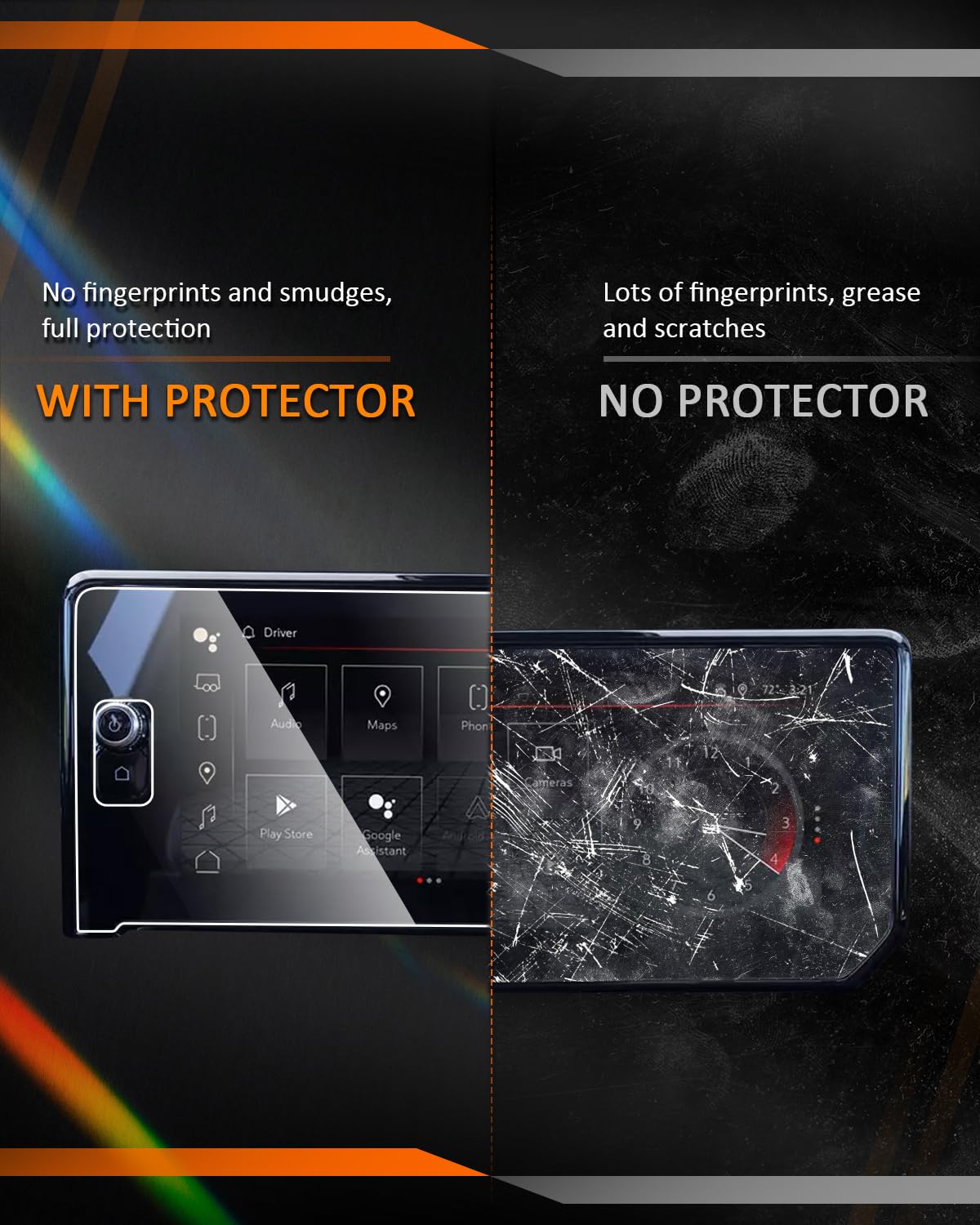 Q: How does the tempered glass protect my touchscreen display?A: The CDEFG tempered glass screen protector offers 9H hardness, providing excellent anti-scratch and anti-explosion protection. It also features anti-glare and UV filtering properties, keeping your screen safe from dust, scratches, oil, water, and fingerprints.