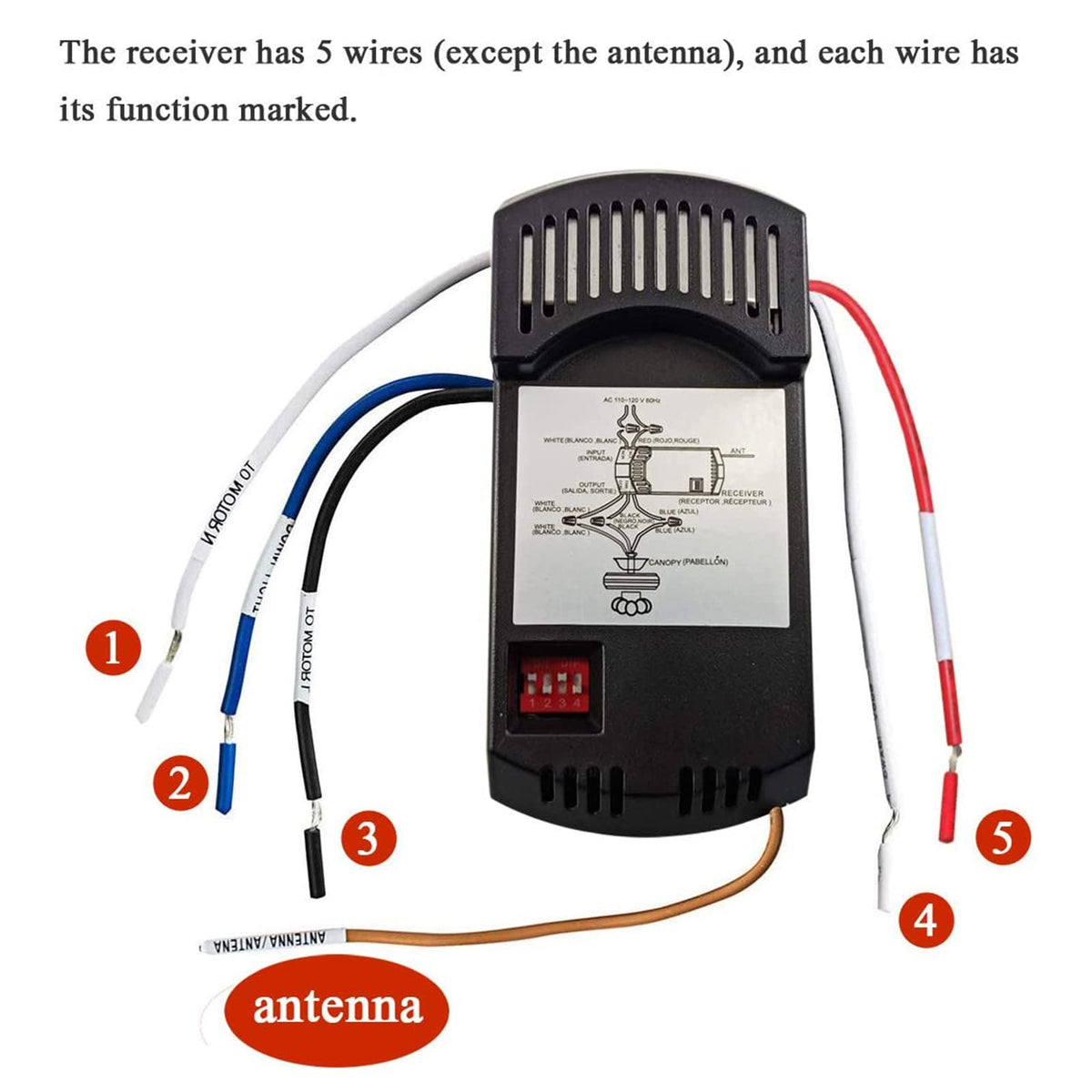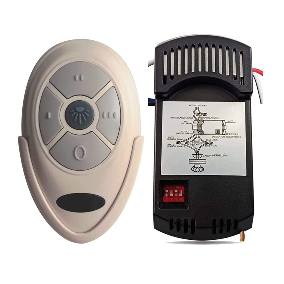 Q: How do I install the ceiling fan remote control kit?A: Installation is straightforward. First, ensure the power is off. Then, match the dip switches on the new remote with those on your old remote. Connect the wires as per the labeled color codes, and use the provided screws and drywall anchors to mount the holder. Refer to the user guide for detailed instructions.
