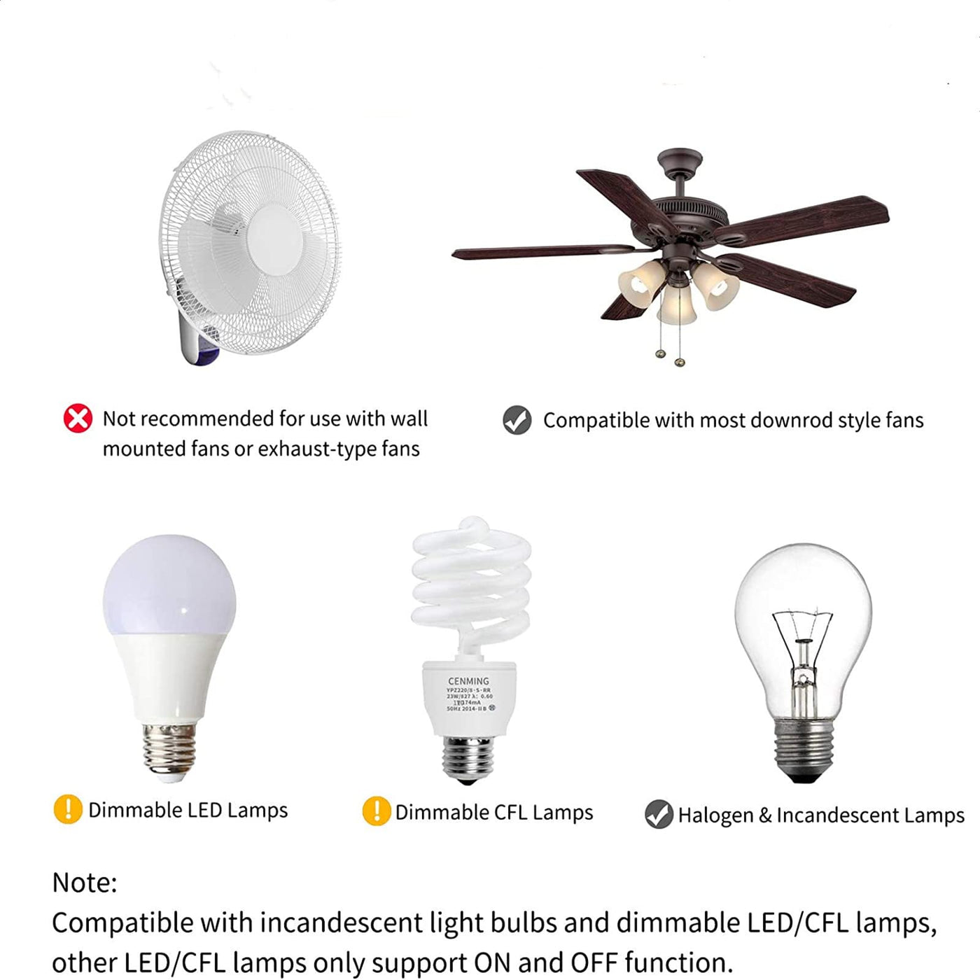 Q: Can I use this remote control to dim LED lights?A: The light dimmer function on this remote works well with incandescent lamps. Most LED and CFL lights are non-dimmable, meaning the dimming function may cause flickering. For LED lights, the remote will only control the ON/OFF function.