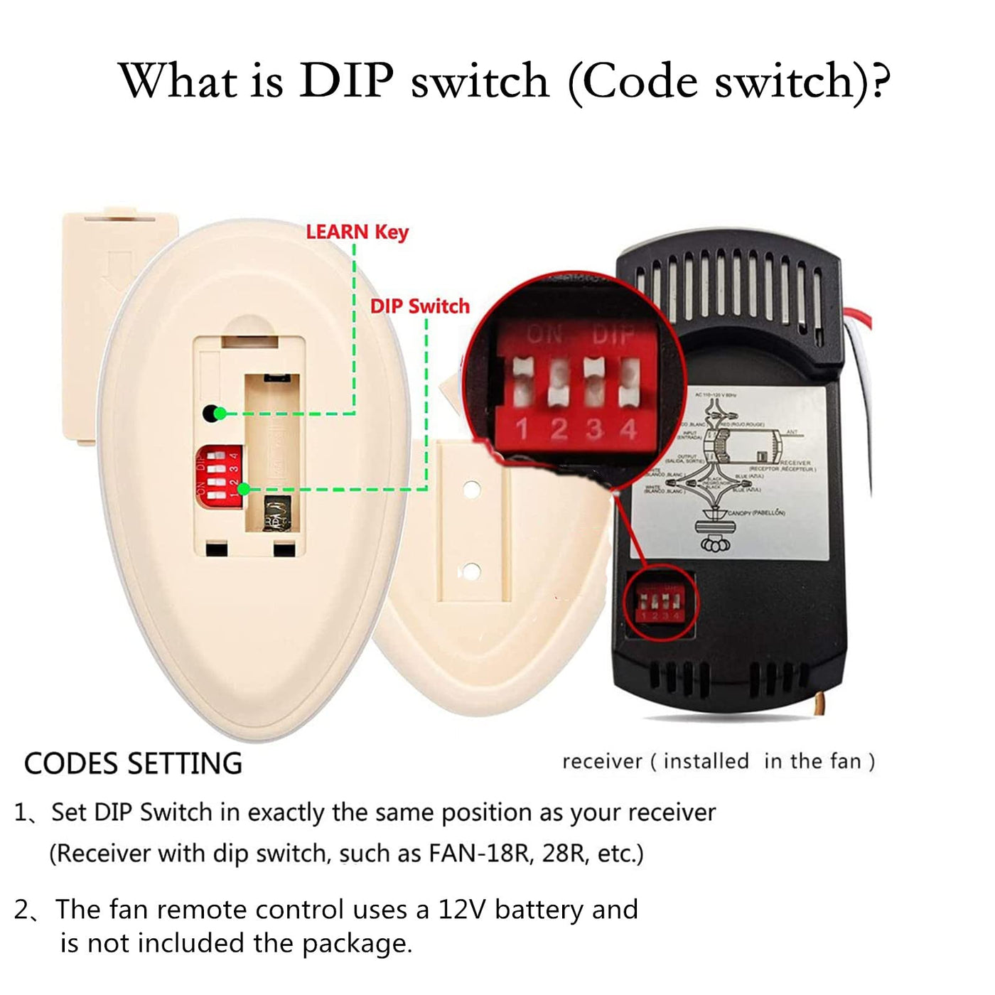 This Fan-35T Ceiling Fan Remote Control Is A Great Replacement For Hunter,Hampton Bay,Allen+Roth, Kichler Ceiling Fans. This Ceiling Fan Remote Control Kit Can Replace Kujce9603 Chq7202T Uc7202T Chq7202T1 Uc7020T A25-Tx007R A25-Tx007R1 .This Ceiling Fan Remote Control Kit Have A Durable And Powerful Black Receiver.This Ceiling Fan Receiver Uses 2 Upgraded Relays, With The New Component The Dimming Function Of The Relay Is Better Than The Thyristor.The Rated Power Of The Receiver Is 240W, Which Far Beyond The General Carrying Power Capacity, It Allows You To Access More Light Bulbs. 3-Speed (High/Medium/Low) And Off For Ceiling Fan. Light/Dimmer: Press To Switch The Light, Long Press To Adjust The Light. The Light Dimmer Works Well With Some Dimmable Cfl/Led Lights And All Incandescent Lamps. Most Led/Cfl Lights Are Non-Dimmable, The Remote Only Control On/Off Function And It May Cause To Flicker When Using The Dimming Function. Matching Dip Switch For The Transmitter And Receiver: Look Inside The Old Remote With The Battery Cover Off. There Is A Series Of '' Dip'' Switches(4) With A Pen, Slide The Switches In The New Remote To Match The Same Pattern As The Old Remote. Replace The Battery In The New Remote And Things Should Work Well.The Ceiling Fan Receiver Wires Are Labelled, And The Wires All Have The Correct Color Codes. The Set Even Comes With The Screws And Drywall Anchors For Mounting The Holder To The Wall.Remote Control *1, Receiver *1, Wall Mount Holder *1, User Guide *1, Wire Nuts *6, Screws *2. This Remote Control Use A 3V Batteries (Not Include). Our Service - 30-Day Money-Back Guarantee For Any Reason; 12-Month Warranty For Quality-Related Issues. If There Are Any Problems With The Purchase, Please Feel Free To Contact Us, We Will Help To Fix The Problem.