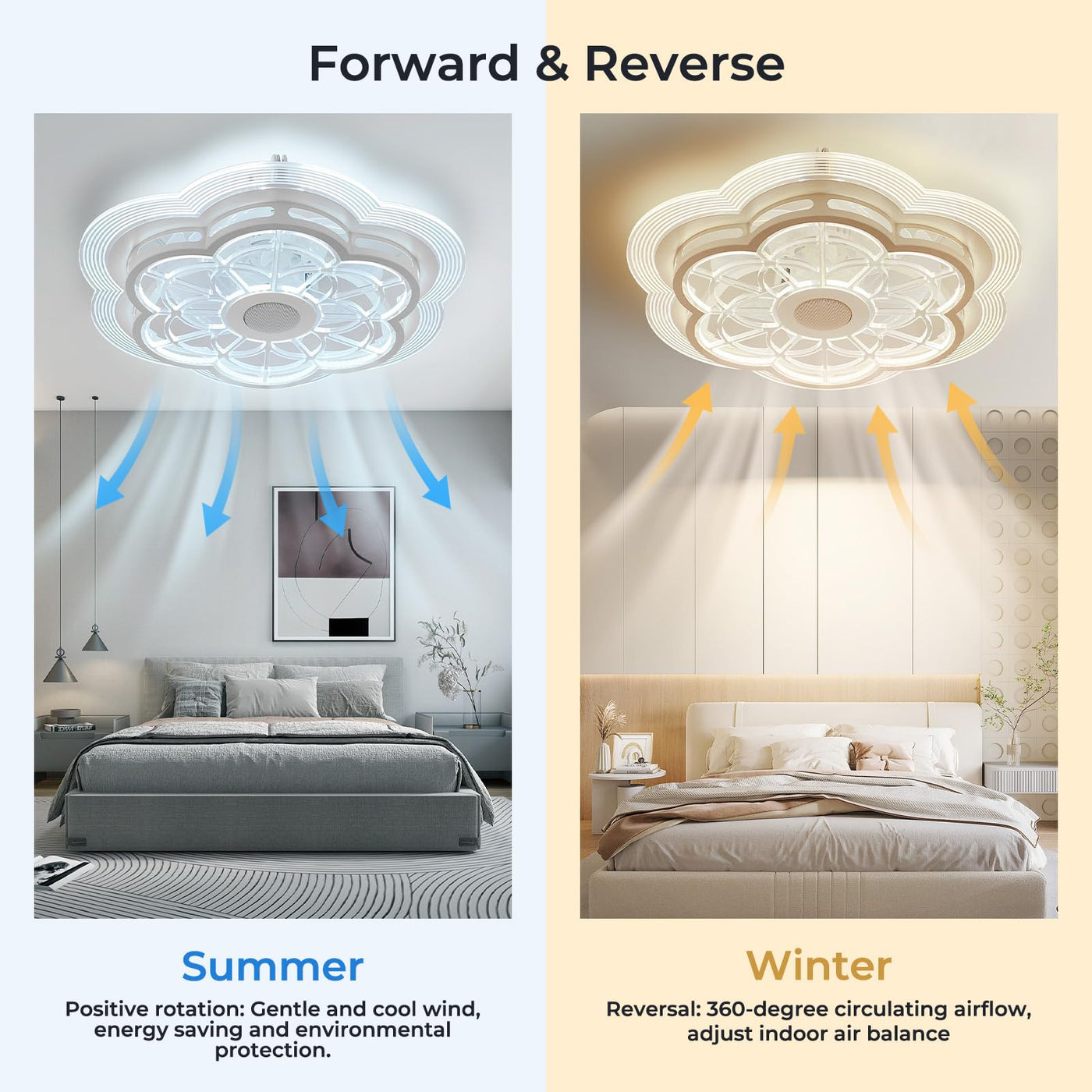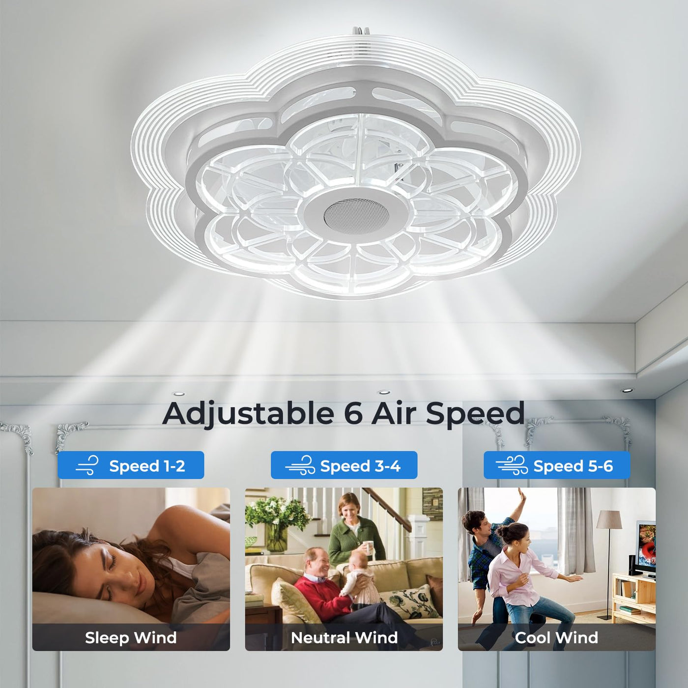 Ceiling Fan With Lights Remote Control, Enclosed Flower Light Fan, With Bluetooth Speaker 3 Colors Dimmable 6 Speeds, Flush Moun