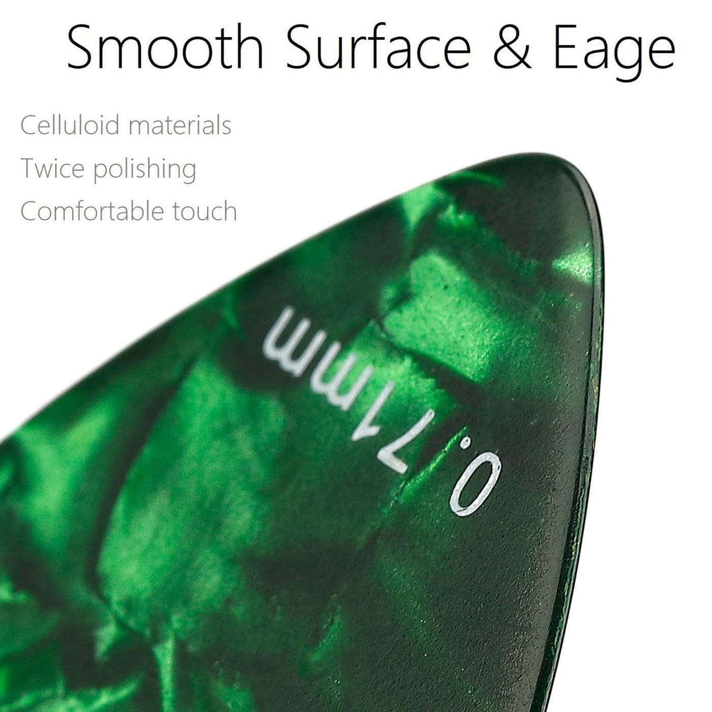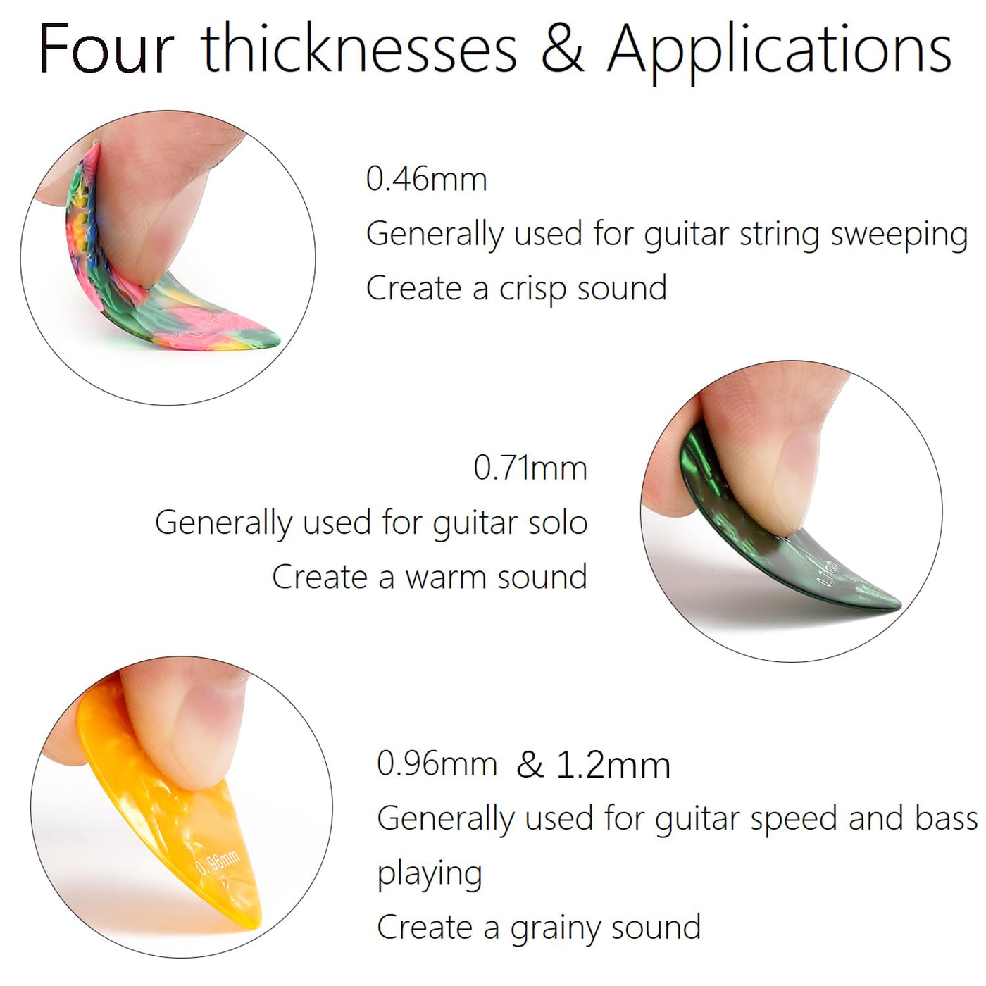 These Guitar Picks Are Made Of Celluloid Plastic, Which Is A Tough And Durable Material That Is Known For Its Warm And Full Sound. The Picks Are Polished Twice To Achieve A Smooth And Polished Look, And They Have A Smooth Edge For A Comfortable Grip. The Picks Come In Four Thicknesses: Thin, Medium, Heavy, And Extra Heavy, So You Can Choose The Right Pick For Your Playing Style. The Thin Picks Have A Crisp And Bright Sound, While The Medium Picks Have A Warm And Grainy Sound, And The Heavy Picks Have A Full Sound. The Picks Are Also Easy To Store In The Box Metal Case, Which Is Durable And Sturdy And Can Prevent Pick Loss. These Guitar Picks Are An Excellent Choice For Both Beginners And Experienced Guitar Players, And They Make A Great Gift For Any Guitar Lover.Four Different Thicknesses: Thin (0.46Mm)*9 Medium (0.71Mm)*3 Heavy (0.96Mm)*2 Extra Heavy (1.2Mm)*1