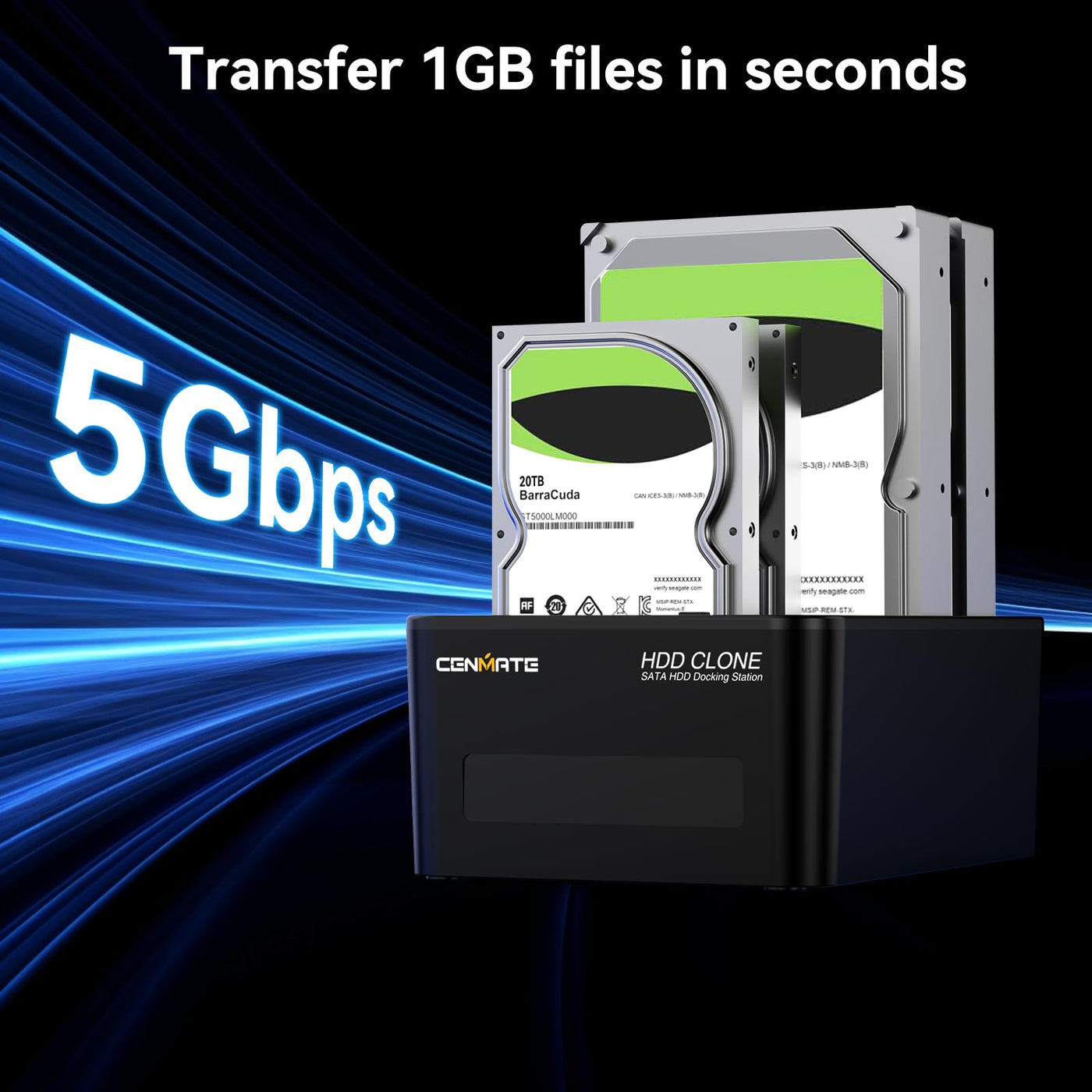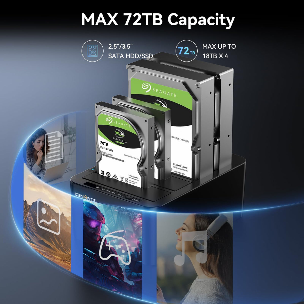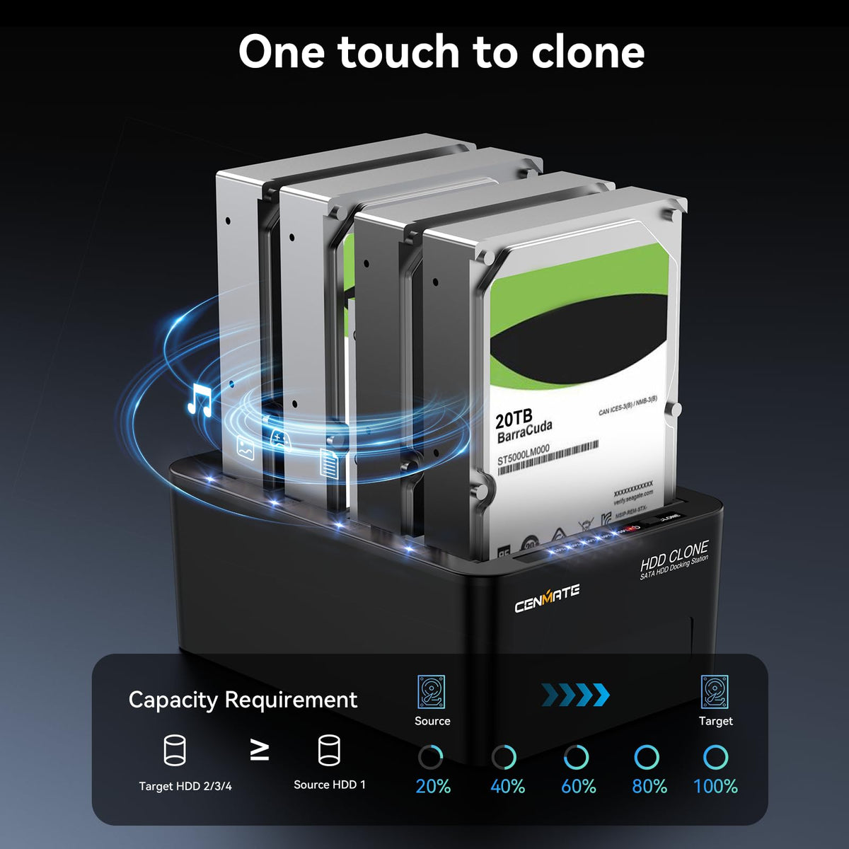 Cenmate 4-Bay Sata Hard Drive Docking Station Let You Access Desktop Or Laptop Hard Drives Directly, Just Insert 2.5''Or 3.5'' Sata Hard Drive Into The Docking Station, No Driver Needed, You Can Access The Contents And Transfer Files From Your Hard Drive. Furthermore, One Touch To Clone Between 4 Hard Drives, Save Time And Energy. Transfer Data Speed Up To 5Gbps Via The Usb 3.0 Cable. Specification Material: Durable Abs External Interface: Usb 3.0 Os Support: Win 10/8/7, Vista, Xp, Mac Os, And Linux Max Transfer Rate: 5Gbps (Usb 3.0), 480Mbps(Usb 2.0) Support Device: 2.5/3.5 Inch Sata I/Ii/Iii Hdd Ssd Support Capacity: Max 80Tb Plug And Play: Support Features Offline Clone Without Computer Connection Support 4 X 18Tb Hard Drive Simultaneously Supports 2.5'' And 3.5'' Sata Hdd And Ssd Support Usap For Fast Transfer Speed Led Indicator To Show The Clone Progress Auto Sleep Mode Start After There Is No Active Within 10 Minutes Standing Design For Excellent Heat Dissipation Compatible Systems: Windows Vista/ 7/ 8, Mac Os 9.1/10.8.4, Linux