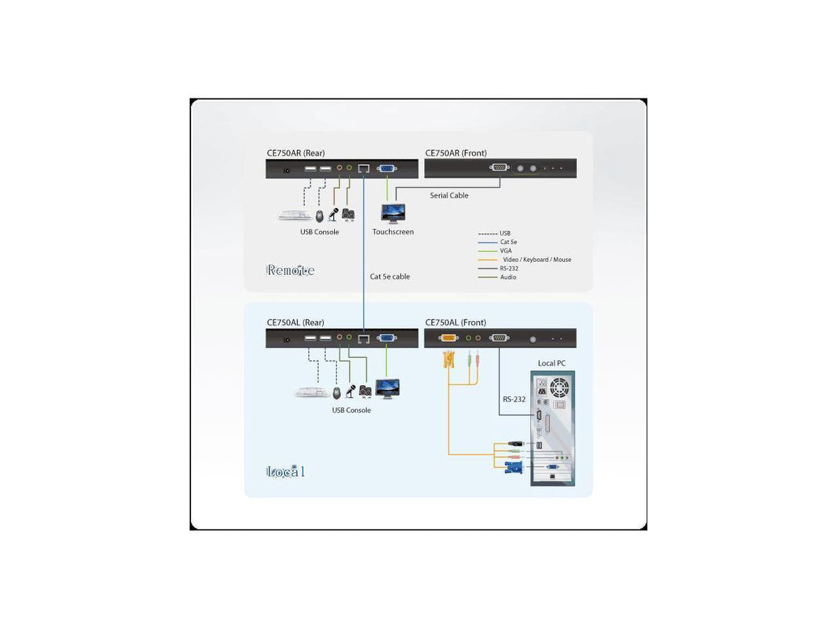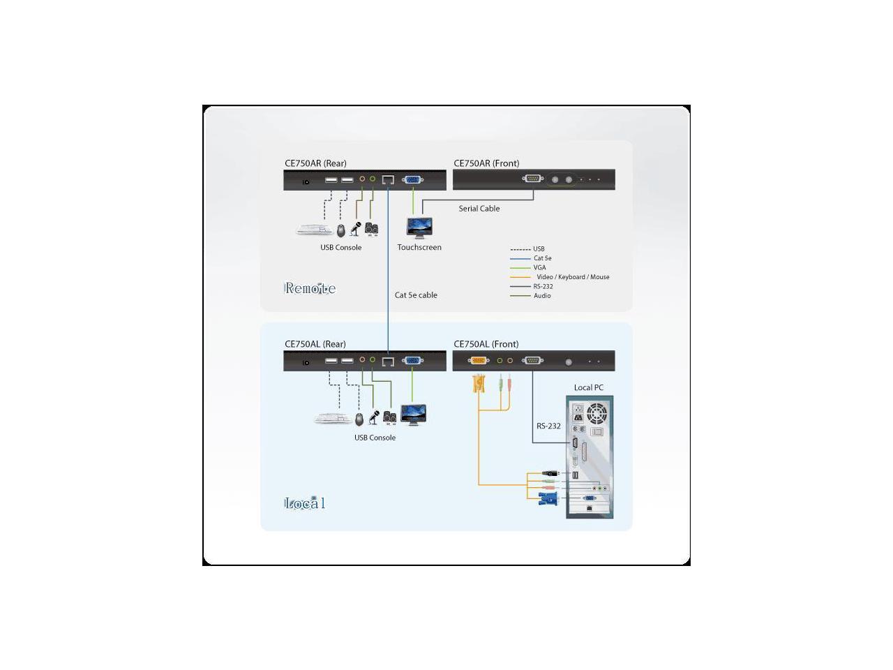 Q: What are the key features of the ATEN CE750A KVM Extender?A: The ATEN CE750A features automatic signal compensation and RS-232 serial functionality. It allows for remote access to a computer system and includes an RS-232 port for connecting serial devices like touchscreens and barcode scanners.