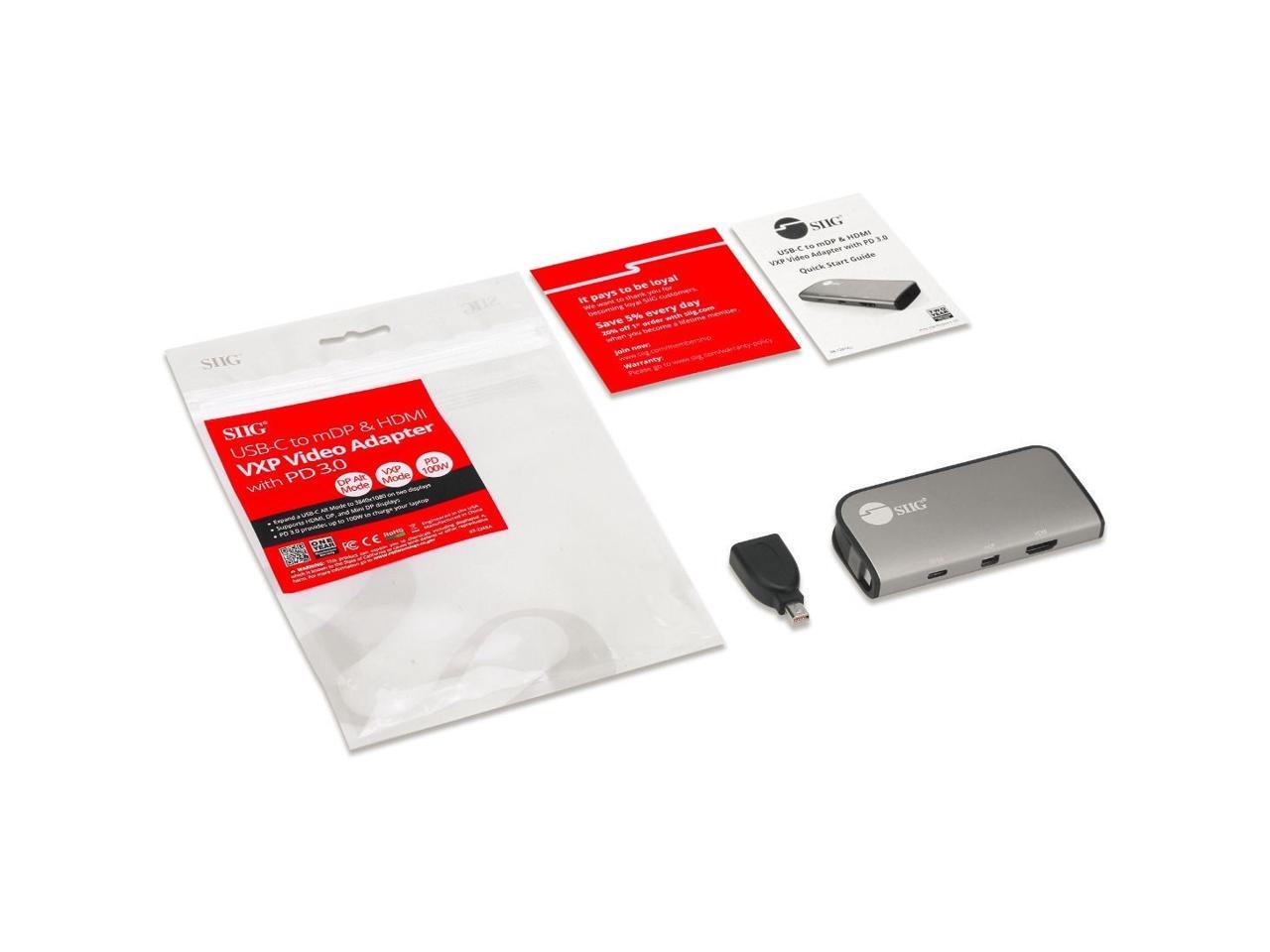 Q: What is included in the package when I purchase the SIIG USB-C to mini DisplayPort & HDMI VXP Adapter?A: The package includes the SIIG USB-C to mini DisplayPort & HDMI VXP Video Adapter with Power Delivery 3.0, a Mini DisplayPort to DisplayPort adapter, and a Quick Start Guide.
