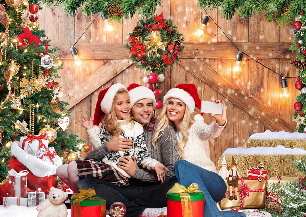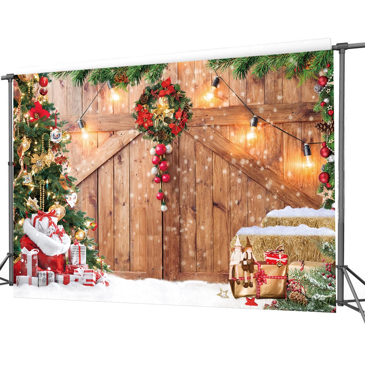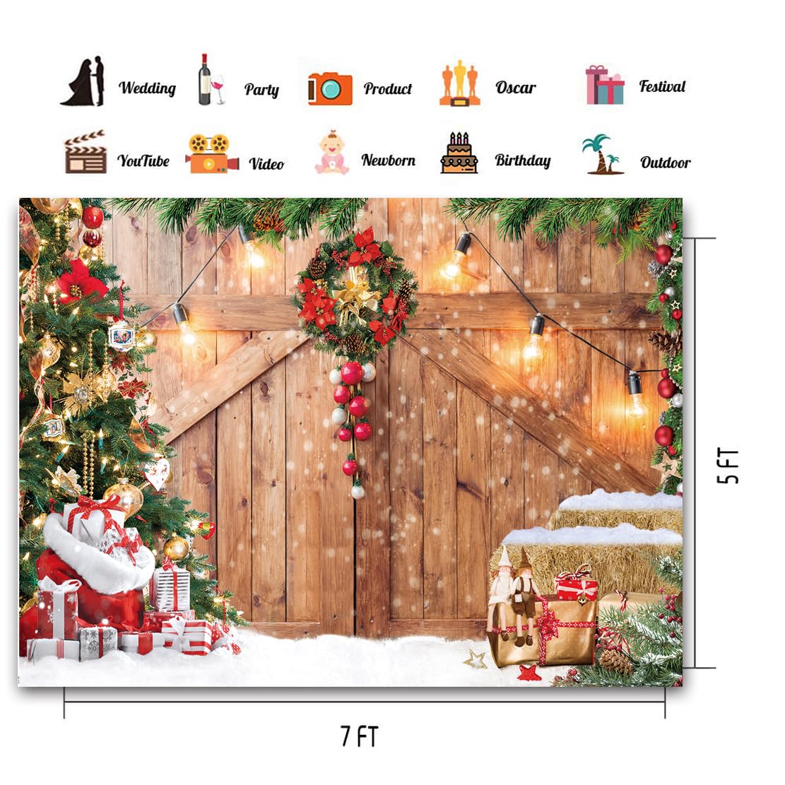 Chaiya 7X5Ft Christmas Backdrop Christmas Barn Wood Door Photography Backdrop Xmas Tree Snow Background Winter Xmas Party Suppli