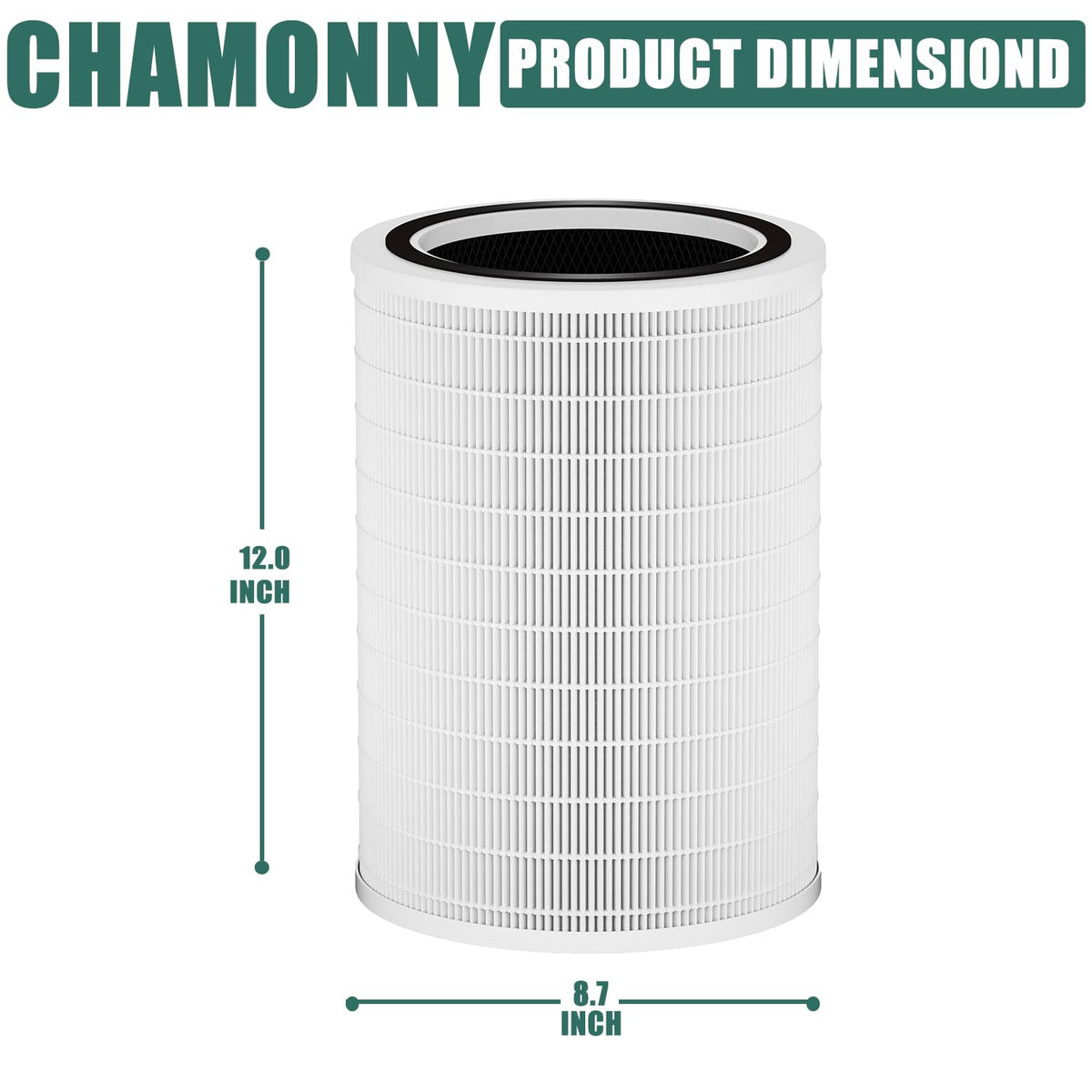 Q: What is the size of the CHAMONNY 12010 Filter Replacement?A: The CHAMONNY 12010 Filter Replacement measures six point fourteen inches in length, five inches in width, and six point fourteen inches in height. This compact size is designed to fit perfectly in compatible air purifiers.