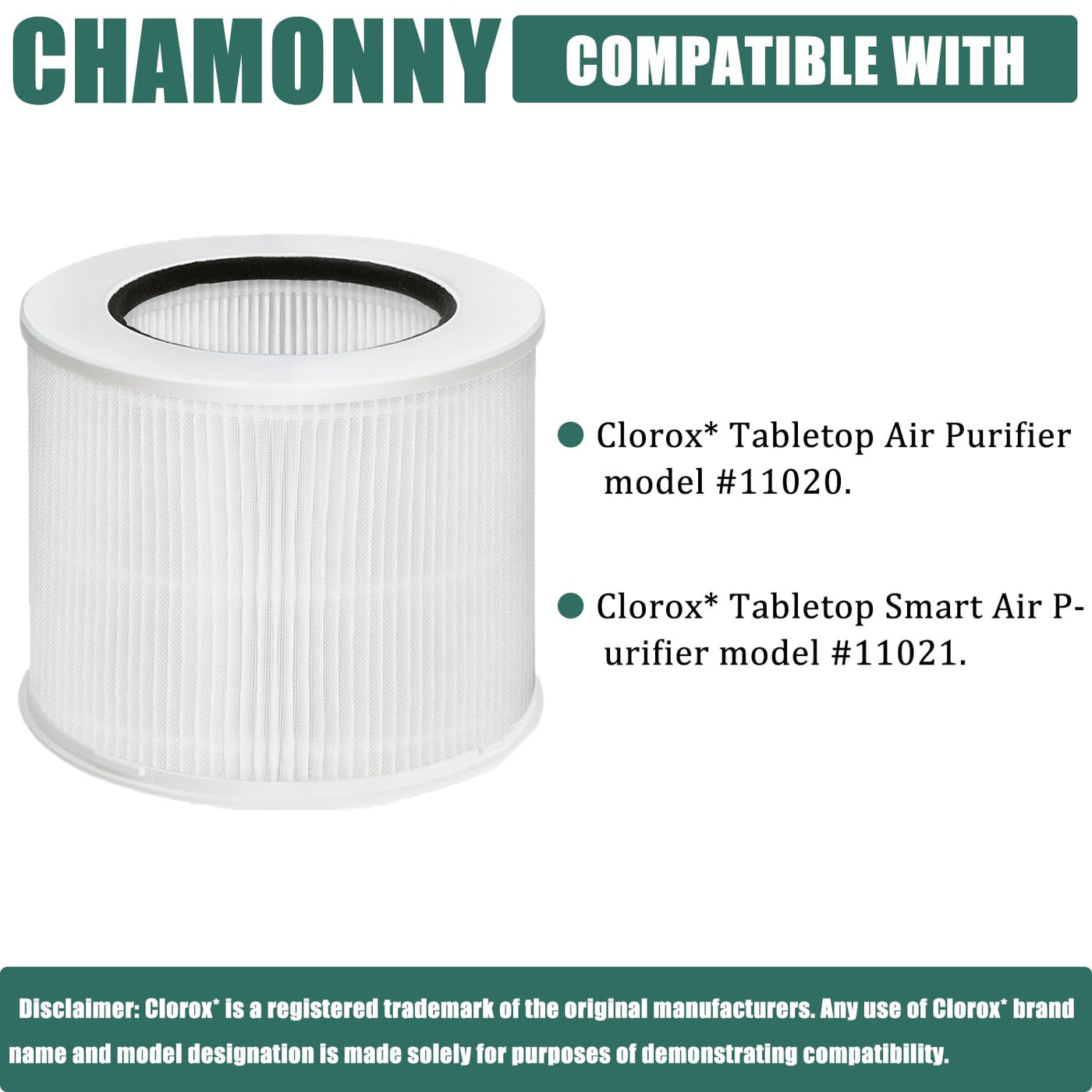Q: Is the CHAMONNY 12020 filter compatible with other models?A: Yes, the CHAMONNY 12020 filter is compatible with Clorox Tabletop Smart Air Purifiers models one hundred ten twenty and one hundred ten twenty-one.