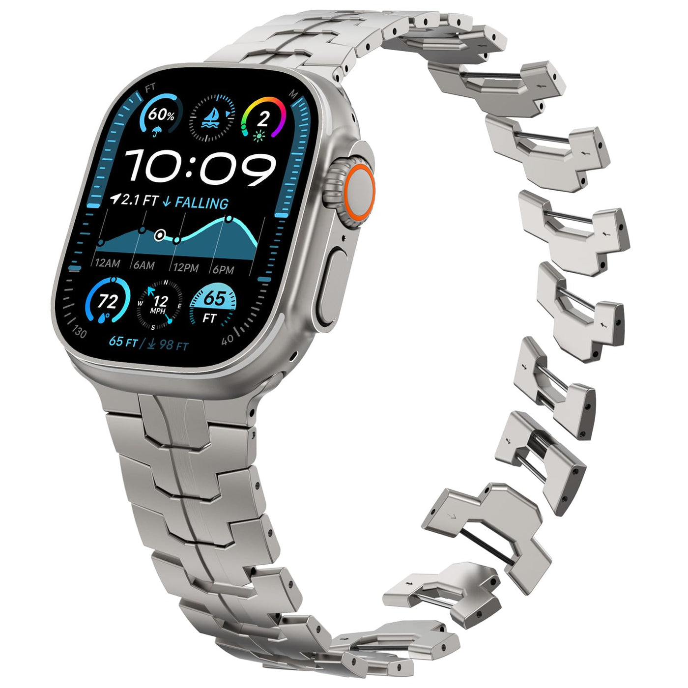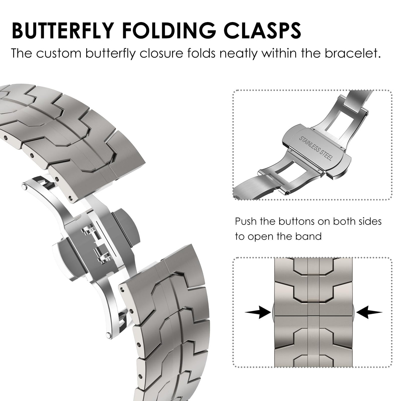 Stainless Steel Braceletinspired By The Iron Man, Crafted From Satin-Brushed 316L Steel Stainless Steel With Folding Buckle, The Masculine, Strong, Flowing Lines And Sharp Aesthetic Gives It A Harmonious Visual Unity Olding Claspsthe Custom Butterfly Closure Folds Neatly Within The Link Bracelet The Hidden Deployment Buckle Opens With A Click Of The Two Side Buttons, Without Any Special Tools Adjustable Lengthtwelve Links Can Be Removed Fits 55A-91A (140-230Mm) Wrists, You Can Keep The Original Length Or Adjust It By Adding And Taking Away Links To Suit You If You Need More Links, Pls Contact Us To Get Additional Link Bracelet Kit Easy Installationthere Are Installation Image And Video On Our Product Page And Instruction Is Included In The Package Package Included: 1 X Apple Watch Band, 1 X Removal Tool Kit, 1 X Instruction Manual And More Pins Compatible For Apple Watch Ultra 49Mm, Apple Watch Ultra 2 49Mm, Apple Watch Series 987654321 45Mm 44Mm 42Mm Our Quest For Excellenceyour Satisfaction Is Our Best Reward Enjoy 18 Months Complimentary Exchange Or Refund Without Return Please Contact Our Customer Service Team To Serve You