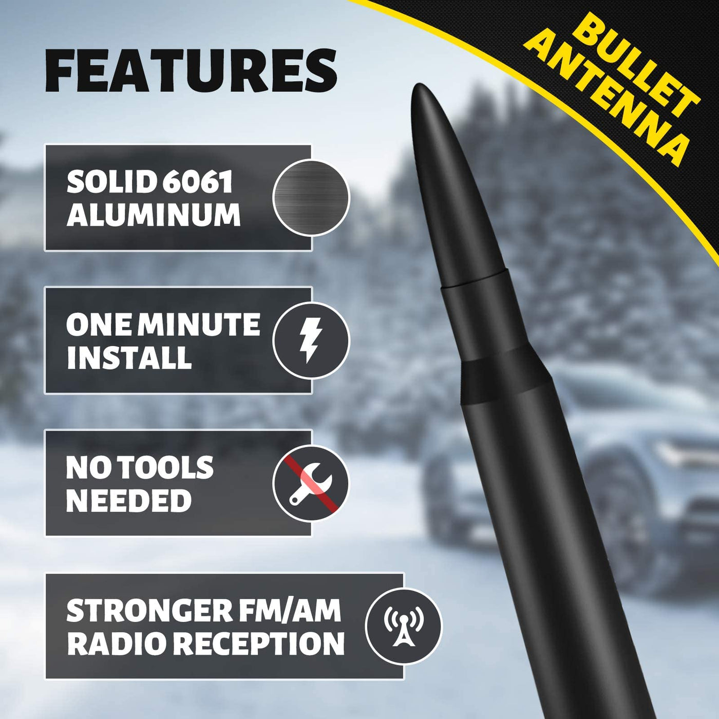 Q: What material is the CHAOGANG antenna made from?A: The CHAOGANG 5.3inch Car Short Antenna is made of high-quality T-6061 billet aluminum, featuring a durable matte black finish for added aesthetics and longevity.