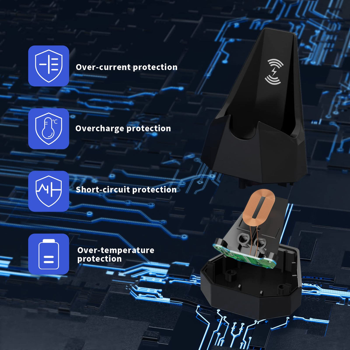 Q: What safety features does the charging dock have?A: The charging dock includes multiple safety features such as overvoltage output protection (OVP), overcurrent output protection (OCP), short circuit protection (SCP), and over temperature protection (OTP) to ensure safe charging.