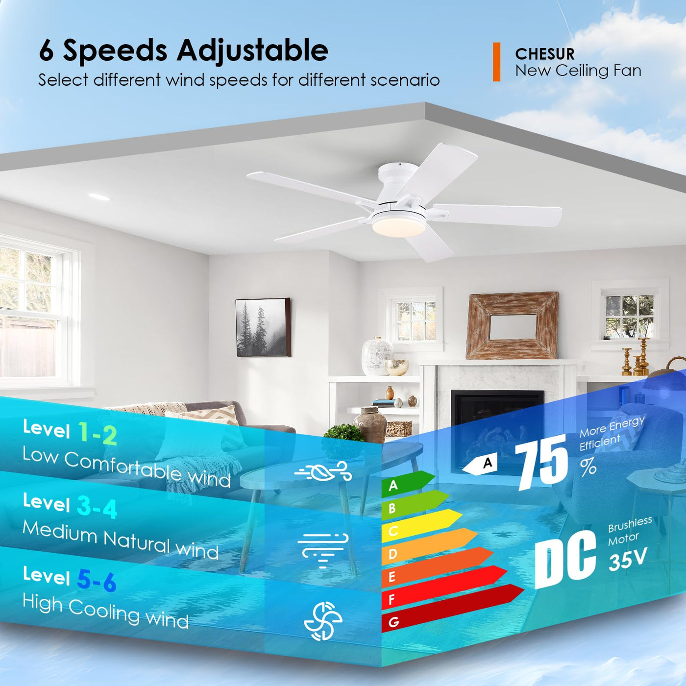 Q: Is the CHESUR Ceiling Fan energy-efficient?A: Yes, the CHESUR Flush Mount Ceiling Fan is designed to be energy-efficient. Its high CFM performance ensures effective airflow, allowing you to maintain a comfortable environment while minimizing energy consumption.