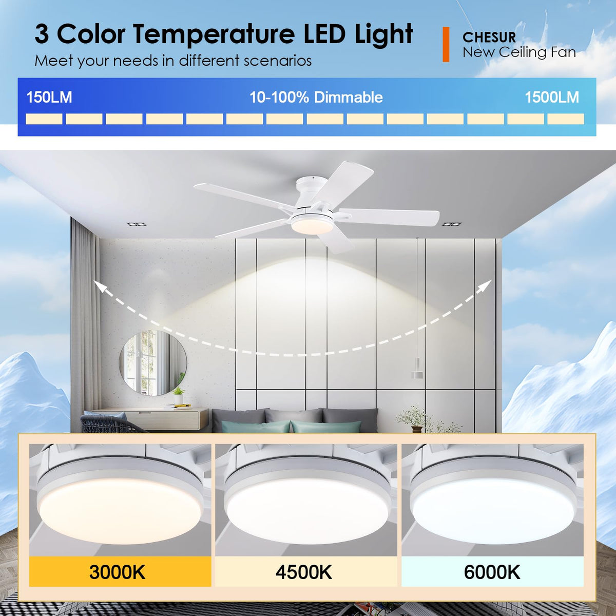 Q: What are the key features of the CHESUR Flush Mount Ceiling Fan?A: The CHESUR Flush Mount Ceiling Fan features a sleek 52-inch design with RGB side lights, 5 dual-sided plywood blades, a dimmable reversible motor, and a multi-functional remote control for easy operation. It is suitable for both indoor and outdoor use, making it ideal for various settings such as bedrooms, living rooms, and patios.