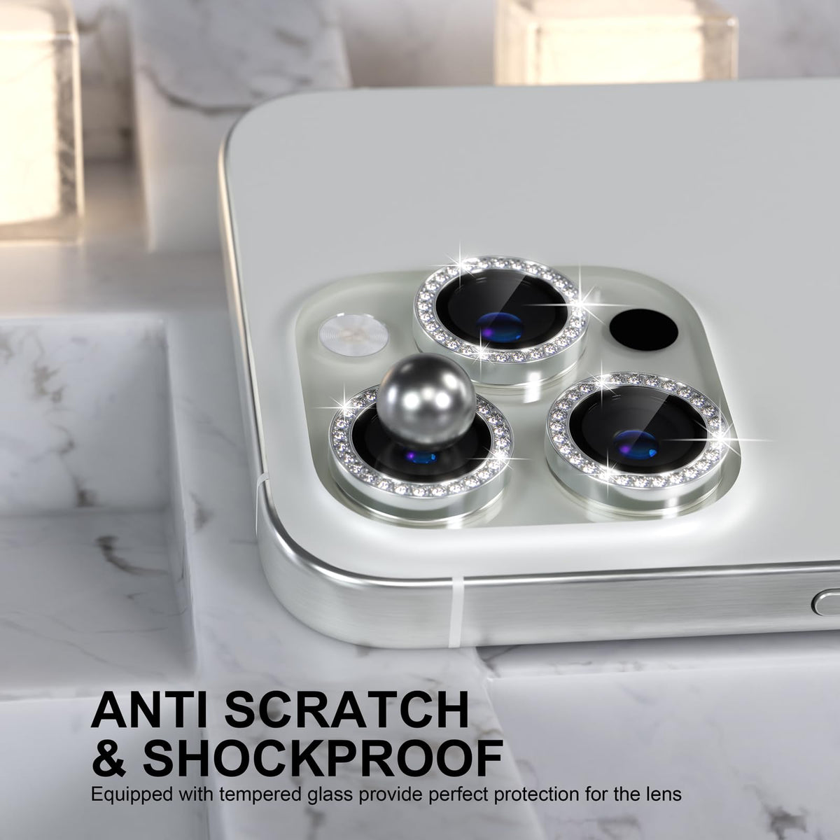 Q: What materials are used in the construction of this camera lens protector?A: This camera lens protector is made from high-quality aviation aluminum for the metal ring and features 9H tempered glass inlaid with bling rhinestones, offering both aesthetic appeal and robust protection.