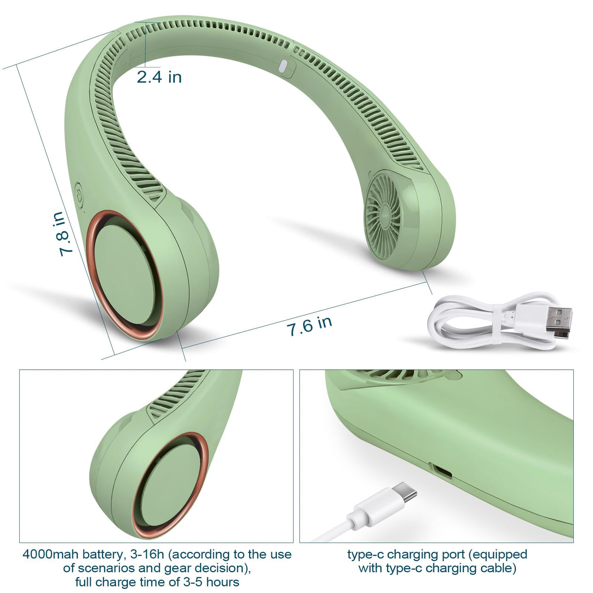 Portable Neck Fan, Hands-Free Fan, Suitable For Sports, Outdoor, Indoor Why Choose? Scope Of Application: Suitable For Indoor And Outdoor Activities, Office, Subway, Travel, Camping, Picnics, Hiking. Three Wind Speed: Press The Power Button To Freely Adjust The Wind Speed. Three Wind Speeds Are Available. Cool And Safe: 78 Air Outlets, 360 Cool Wind. Keep Your Face Cool And Won'T Let Sweat Mess Up Your Makeup. Bladeless Design: Compared With Traditional Neck Fans, The Upgraded Neck Fan You Do Not Have To Worry About Hair Being Rolled Up Into Fan Blades. Safe To Use For Children And Adults. Battery Endurance: 4000 Mah Battery Operated Wearable Personal Fan, The Endurance Is About 3-16 Hours. (The Length Of Use Depends On Different Wind Speeds) Shape Design: Headphone Style Design, Semi-Closed Air Inlet, Dustproof And Sweatproof. Specification Double Turbo Design, 78 Outlets, 360 Cooling Product Name: Protable Bladeless Ceiling Neck Fan Material: Abs + Pc&Nbsp; Product Size: 7.87X7.56X2.36 Inches Product Weight: 8.9Oz Input Power: 5V/1A Battery Capacity: 4000Mah Charging Time: About 3-5 Hours Running Time: 3-16H (Depending On The Use Of Scenarios And Gears) Interface Type: Usb-C Charging Port: Type-C Battery Life: Rechargeable Usb-Powered Package 1X Bladeless Neck Fan 1X Usb Charging Cable 1X Instruction Manual