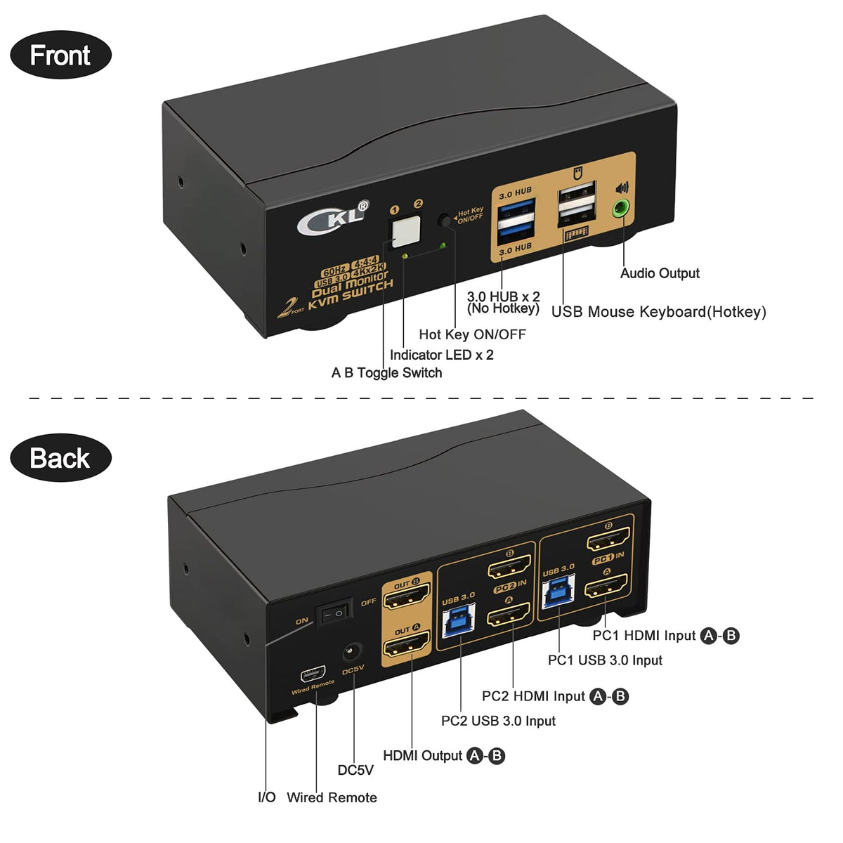 Ckl 2 Port Usb 3.0 Kvm Switch Dual Monitor Hdmi 4K 60Hz, Keyboard Video Mouse Peripherals Switcher For 2 Computers 2 Monitors Wi
