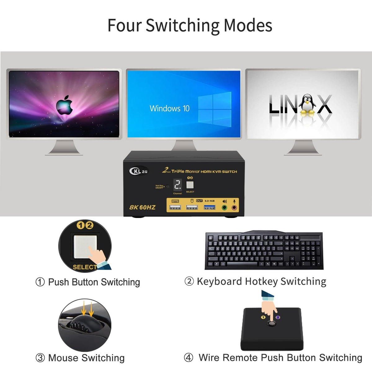 1. Kvm Usb Hdmi Switch: 2 Computers In, 3 Monitors Output. It Allows One Set Of Usb Keyboard & Mouse Controls 2 Pcs/Laptops, And 3 Monitors. Supports Emulation Edid(Default Turn On, You Can Turn It Off If Needed), Hdmi 2.1, Hdcp, And Hdr. (Tips: If You Want To Use 3 Monitors, You Should Confirm That The Computer With 3 Video Outputs. If One Of Your Computers With 2 Video Outputs, Only 2 Monitors Have Display. ) | 2. Usb Hdmi Kvm Switch: We Have Been Certified Hdmi Adopters For Over 10 Years. Excellent Image Processing And Transmission Capacity, Make The Output Signal Is More Smooth And Steady. Drive-Free For Windows 10/7/2000/Xp/Vista, Linux, Mac, Debian, Ubuntu, Fedora, Raspbian, Ubuntu, Etc. | 3. Keyboard Mouse Monitor Switch: Support Wired/Wireless/Unified Keyboard And Mouse, Apple Keyboard (Hotkey Is Changeable), Touch Screen, Oled Screen, 16:9 Widescreen, 21:9 Ultra-Wide Monitors, Etc. Support Auto Detection, Auto Scan, And Waking Up, With Memory Function In Case Of Power-Down. It Can Be Switched By Mouse Or Keyboard Independently, Even Without Usb Signal Input, Such As Apple Tv, Android Tv Box, Etc. And It Can Enter Into The Bios Interface Directly. | 4. 8K Monitor Switcher: Resolution Compatible 7680X4320@60Hz, 5120X2880@50/60/100/120Hz, 4096X2160@50/60/100/120Hz, 3840X2160@60/120/144Hz, 3840X1620@60/120/144Hz, 3440X1600@60/120/144Hz, 3440X1440@60/120/144Hz, 3840X1080@60/120/144/165/240Hz, 3200X1800@60/120/144/165/240Hz, 2560X1440@60/120/144/165/240Hz, 2048X1536@60/120/144/165/240Hz, 2048X1280@60/120/144/165/240Hz, 2048X1080@60/120/144/165/240Hz, 1920X1200@60/120/144/165/240Hz, Etc. | 5. Kvm Usb Switch: Four Switching Ways Optional: Keyboard Hotkey Switching (Num Lock + Num Lock + 1 / 2 + Enter, Or Ctrl + Ctrl + 1 / 2 + Enter Or Scroll Lock+ Scroll Lock+1 / 2 + Enter), Mouse Switching (Click Mouse Wheel 2 Times), Manual Button Switching, And Wired Remote Push-Button Switching.