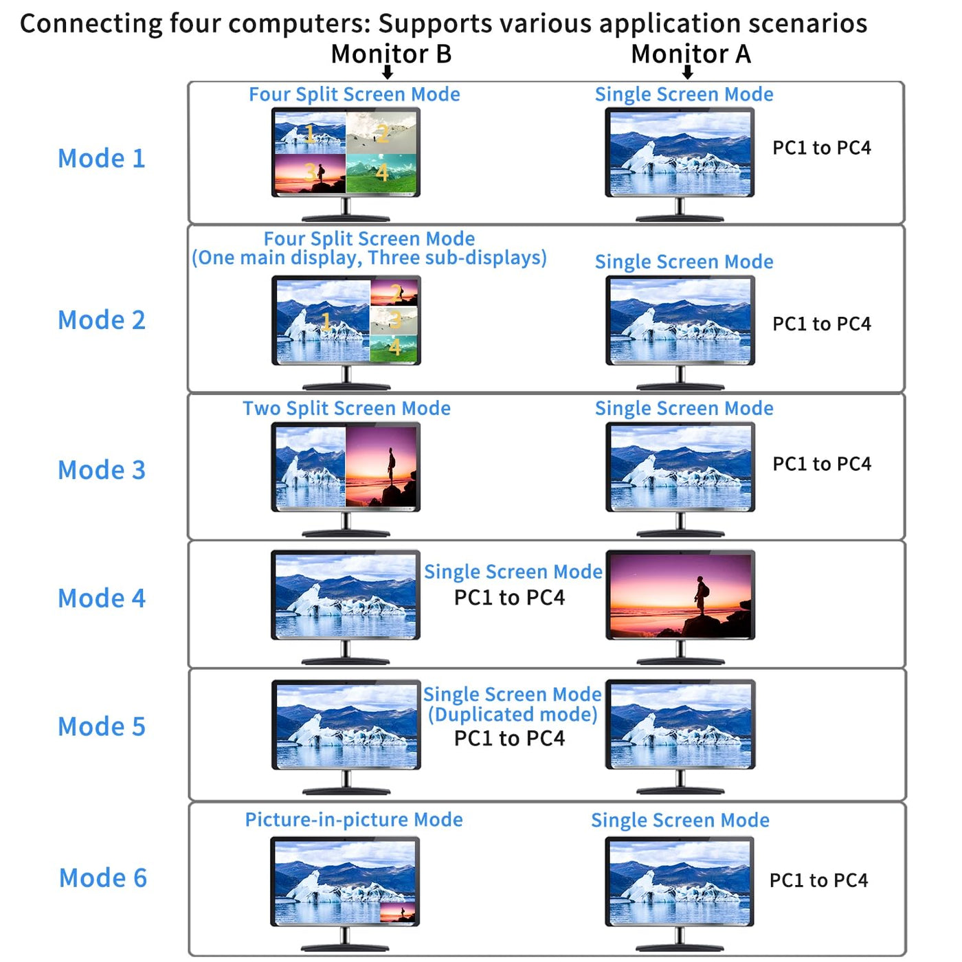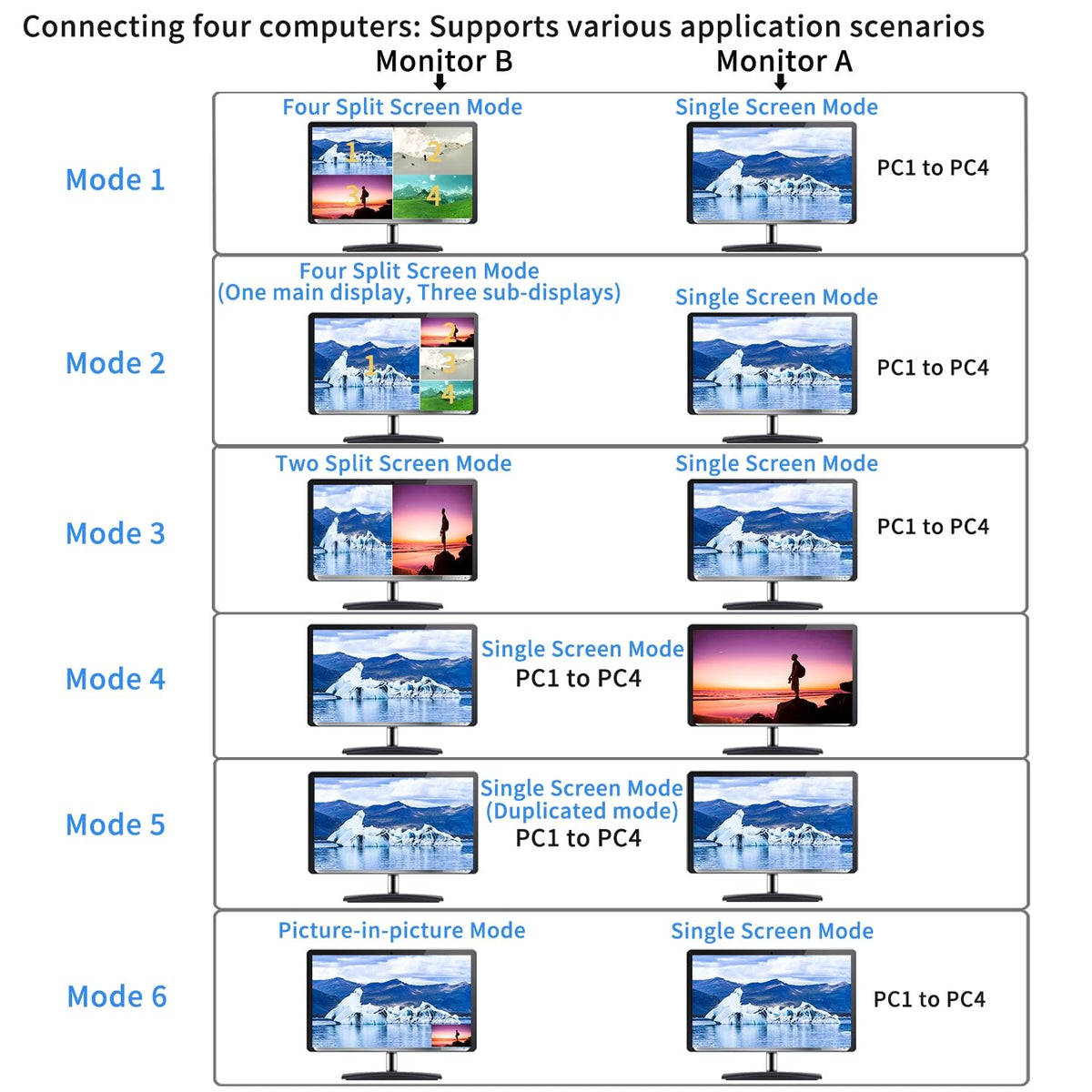 1. 4X2 Kvm Switches: 4 Computers/2 Computers In, 2 Monitors Out. Supports Emulation Edid. Supports Single-Screen, Dual-Screen, And Quad-Screen Modes, Including Split And Picture-In-Picture Functions. | 2. When Connect 4 Pcs (Each With 1 Video Output) To The Kvm Switch, 6 Scenarios Emerge: One Monitor Remains The Main Display For Any Computer (Editable); The Other Can Show Four Equal Split Screens (Each For A Different Computer, Non-Adjustable), Or Four Split Screens With A Larger Main Display On The Left And Three Stacked Sub-Displays On The Right (Interchangeable), Picture-In-Picture (Two Pcs), Two Split Screens (Two Pcs), A Single Screen (Any Computer), Or Duplicated Screen(Single Screen). | 3. Connect 2 Dual-Graphics Card Pcs To A Kvm Switch For 6 Scenarios: 1. Extended Mode: One Monitor Splits Into Four (Top For Pc1'S Main/Secondary, Bottom For Pc2'S). The Other Shows Either Pc1 Or Pc2'S Main Screen. 2. Duplicated Mode: Like Extended, But Top Duplicates Pc1; Bottom Shows Pc2. 3. Slicing Mode: Similar To Extended With A Combined View For Each Pc. You Can Choose Between Extended, Duplicated, Or Splicing Mode For Just One Pc, Utilizing Both Monitors For Flexible Display Management. | 4. Kvm Switch 2 Monitors 4 Computers: Supports Wired Remote Push-Button Switching, Manual Button Switching, Keyboard Hot-Key Switching, And Mouse Switching. | 5. 4X2 Hdmi Monitor Switch: We Have Been Certified Hdmi Adopters For Over 10 Years. Resolution Only Compatible 3840X2160@30Hz And 1080P@60Hz. If Your Device Is Not In The Above Two Resolutions, Please Adjust The Input And Output Resolutions Of Your Device To 4K@30Hz Or 1080P@60Hz.