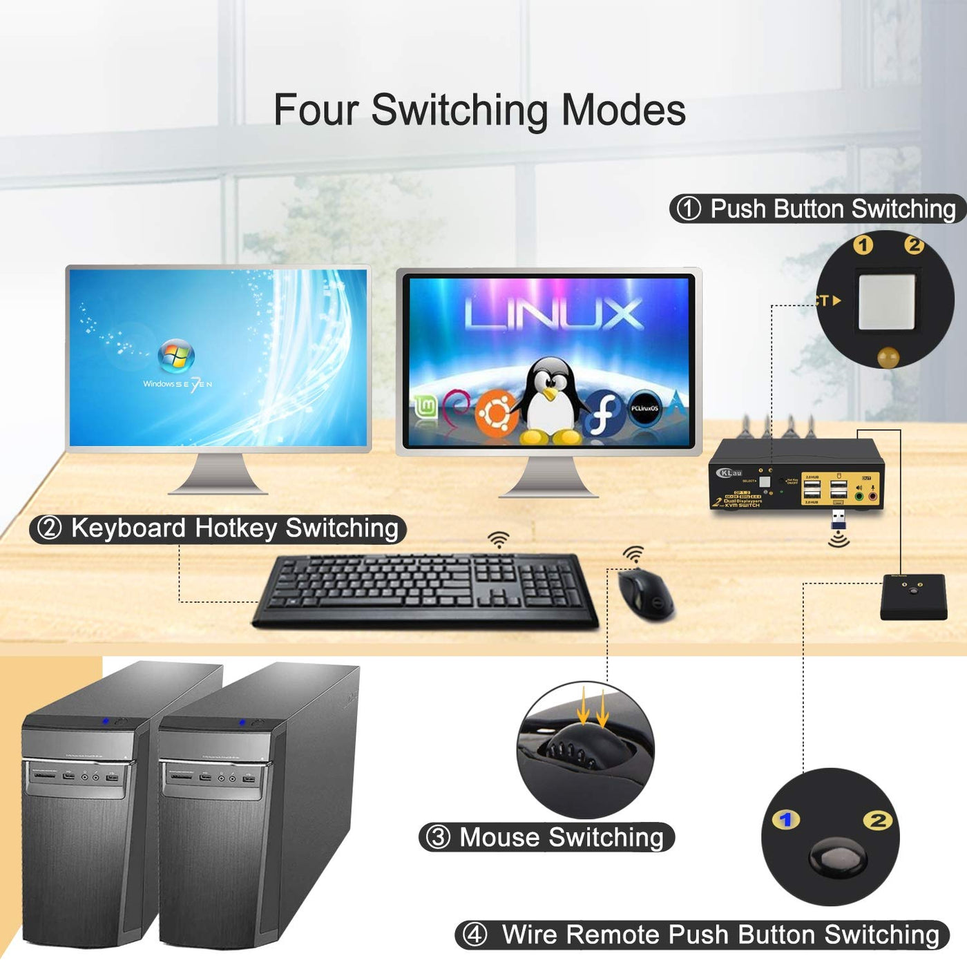 1. Displayport Kvm Switch Dual Monitor: 2 Computers Sharing One Set Of Keyboard & Mouse, 2 Monitors, Audio, And 2 Pcs Usb 2.0 Peripheral Devices. (Tips: 1. It Supports Dp 1.2 And Dp 1.4 Versions At 4K 60Hz Refresh Rate Only. Please Set Your Devices To 4K@60Hz Before Using Them. 2. This Kvm Switch Required Each Of Your Computers With 2 Video Output Or Multi-Video Output. 3. This Item Without Edid Simulation.) | 2. Dual Monitor Kvm Displayport: Four Optional Switching Ways: Hotkey Switching(Num Lock + Num Lock + 1 / 2 + Enter, Or Ctrl + Ctrl + 1 / 2 + Enter, Or Scroll Lock+ Scroll Lock+1 / 2 + Enter), Mouse Switching (Click Mouse Wheel 2 Times), Manual Button Switching, Wired Remote Push Button Switching. Suport Three Display Modes: Extended Display, Mirror Display And Splice Wall Display. | 3. Displayport Kvm Dual Monitor: Support Wired/Wireless/Unify/Bluetooth Keyboard/Mouse, Apple Keyboard (Hotkey Is Changeable), Touch Screen, Oled Screen, 16:9 Widescreen, 21:9 Ultra-Wide Monitors, Etc. (Bluetooth Keyboard/Mouse Should With A Receiver, It Doesn'T Support Built-In Bluetooth Keyboard/Mouse) | 4. Displayport Kvm Switch 2 Monitors: Max Resolution Up To 4096X2160@60Hz 4:4:4, Compatible 3840X2160@60Hz, 3840X1620@60Hz, 3440X1600@60Hz, 3440X1440@60Hz, 3840X1080@240Hz, 3200X1800@60Hz, 2560X1440@60Hz, 2048X1536@60Hz, 2048X1280@60Hz, 2048X1080@60Hz, 1920X1200@60Hz, 1920X1080@60Hz And Lower Resolution. Drive-Free For Windows 11/10/7/2000/Xp/Vista, Linux, Mac, Debian, Ubuntu, Fedora, Raspbian, Ubuntu, Etc. | 5. Kvm Switch Dual Monitor Displayport: Support Auto-Detection, Waking Up, And Auto Scan Mode For Monitoring All Computers/Macs/Laptops. Build-In Memory Function In Case Of A Power Outage. Metal Case Body With A Premium Finish, Space-Saving Design With Non-Slip Foot Pads. If You Meet Monitor Flicker Issue, Please Contact Us On Amazon, And We Will Send You The Displayport 1.4 Cables With Magnetic Ring, It Can Solve The Issue. | 6. If Only One Computer Is Bios-Based, Start By Turning It On, Logging In, And Waiting For The Display. Switch To The Second Computer And Turn It On. If Both Computers Are Bios-Based, Start The Kvm, Then The First Bios Computer, Log In, Wait For The Display, Switch The Kvm To The Second Computer, And Finally, Turn On The Second Bios Computer. In Short, Don'T Start Both Bios Computers Simultaneously To Avoid Issues Like A Black Screen Or Disabling Your Keyboard And Mouse.