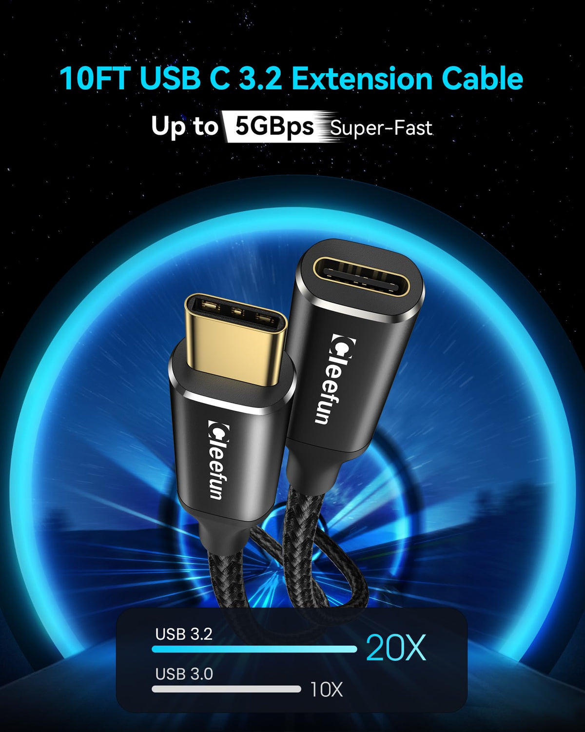 Cleefun Usb C Extension Cable 10Ft, Usb C 3.2 Male To Usb C Female Extension Cable, 5Gbps Data & 4K Video Sync Transfer Usb C Extender Cable 100W Fast Charging For Usbc Hub, Laptop, Tablet, Phone